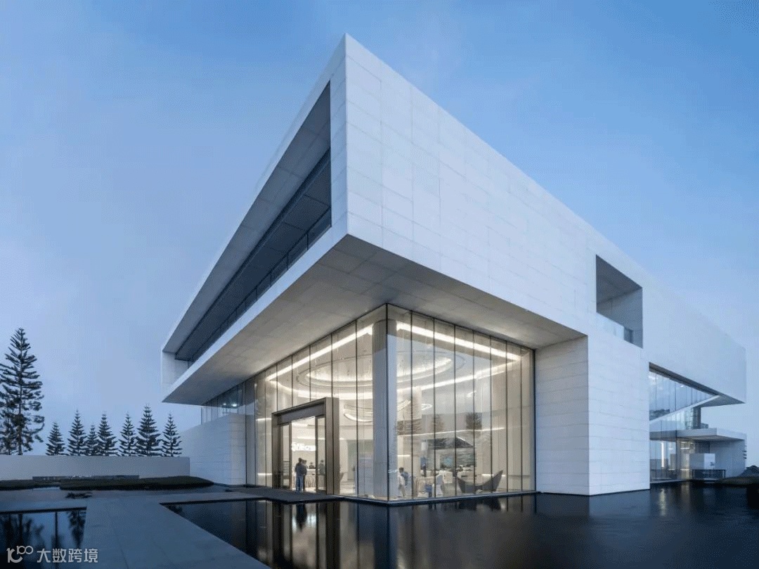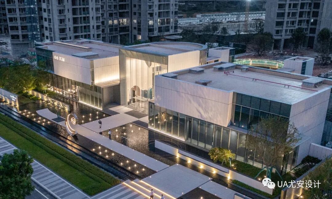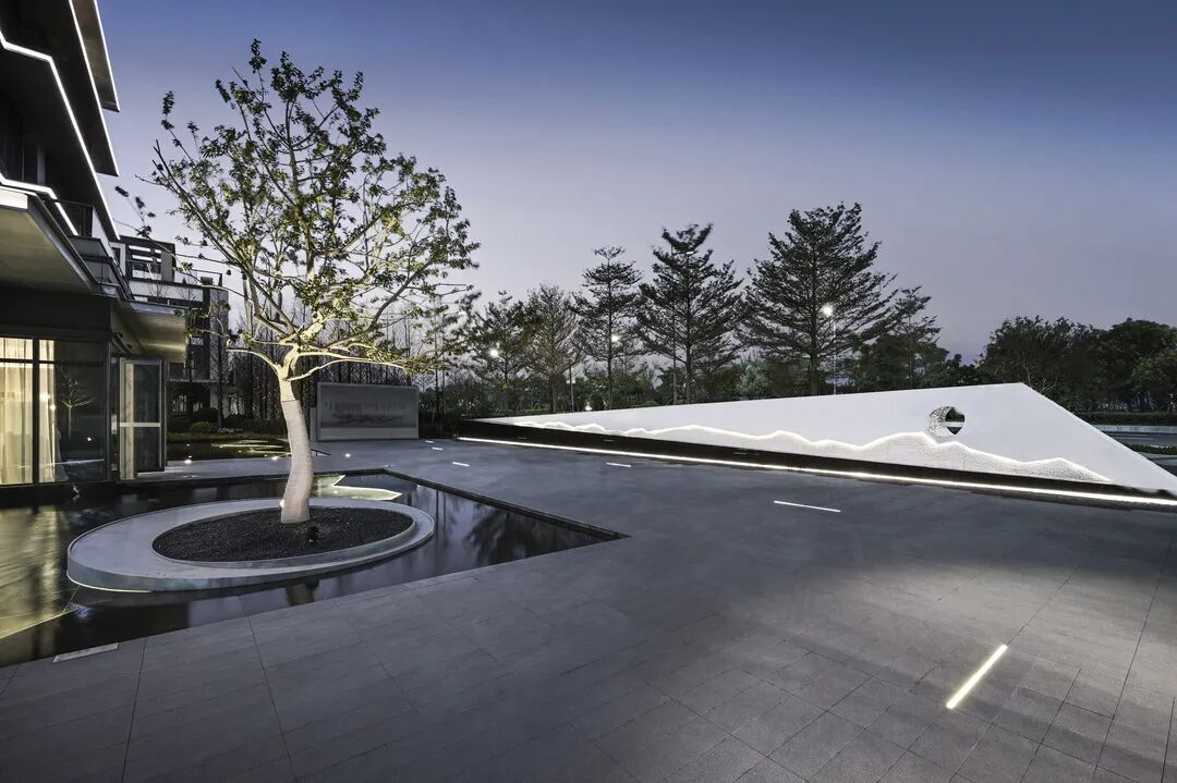 雅居乐·湾际壹号展示中心,建筑主体以干挂的素雅白色泥客石为主,整体更为干净,勾勒出建筑挺拔轮廓。与深色铝合金杆件或者细部相结合,更体现出建筑元素的纯粹。
