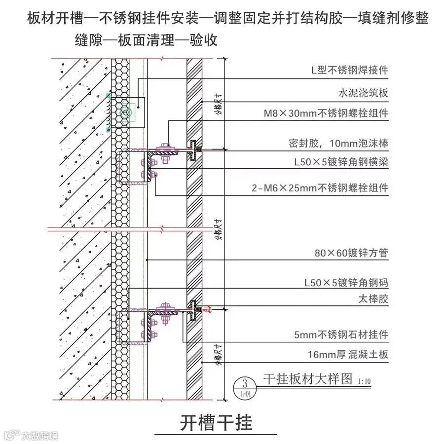 施工流程:测量、放线→配料→弹线定膨胀栓位置→钻孔→连接件安装固定→固定80*60镀锌方管→二次放线→固定水平横梁→焊接点清理并防腐→石材挑选搬运→板材开槽→不锈钢挂件安装→调整固定并打结构胶→填缝剂修整缝隙→板面清理→验收