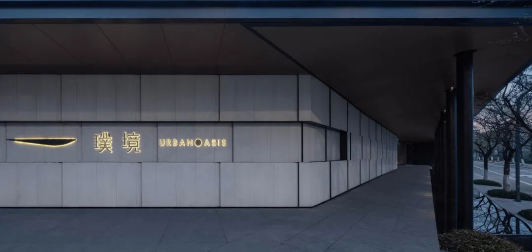 南京璞境示范区,长廊的一边是整面粗犷纹理的米白色泥客石,一边是黑色的廊柱,顶棚是木纹转印铝板。简约的黑白灰+自然的木纹色,恰好与江心洲的自然元素不谋而合。