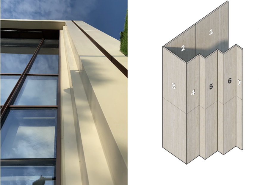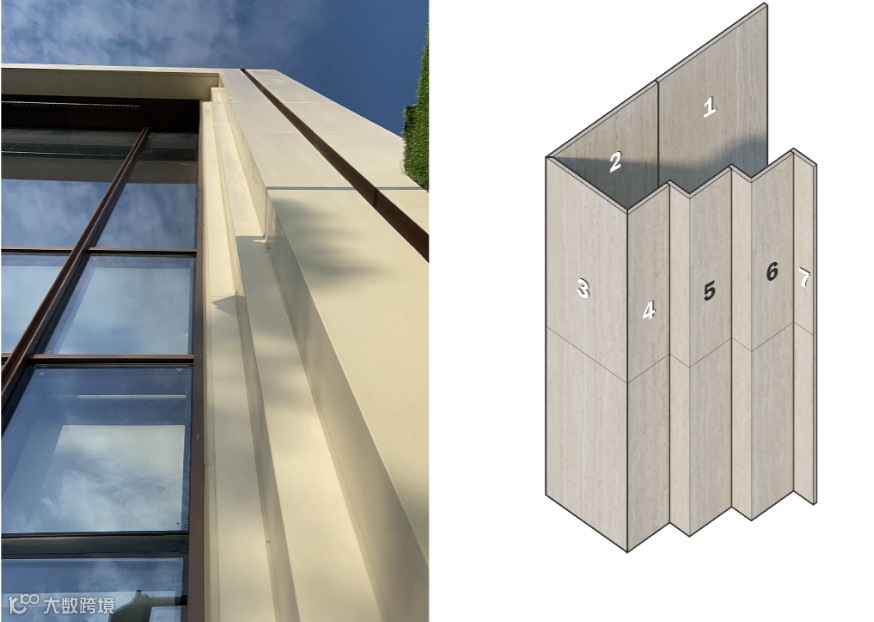 泥客石拼接:1、2、3、4、7号为单块板,现场安装,转角处45°斜切打3mm胶,5、6号为L形板,在工厂加工好在现场直接安装,其他交接处自然留缝1-2mm,打胶3-5mm,对于泥客石45°拼接缝以及垂直拼接的处理,较传统石材整体性更强。