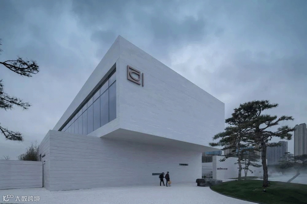 深圳金地峯汇·峰境瑞府展示中心主体材质选用大面积的灰白色泥客石,通体灰白色的泥客石给建筑赋予更为整体的感受,甚至将这种材质延伸至建筑内部,来营造建筑向室内的空间延续。