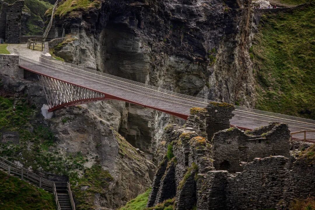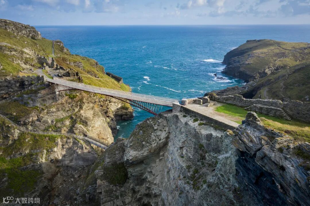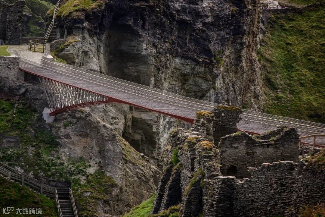 英国的廷塔杰尔城堡人行桥横跨190英尺(约58米)宽的幽深峡谷,连接了位于大陆的13世纪的门楼以及向海面突出的嶙峋海岬上的庭院。