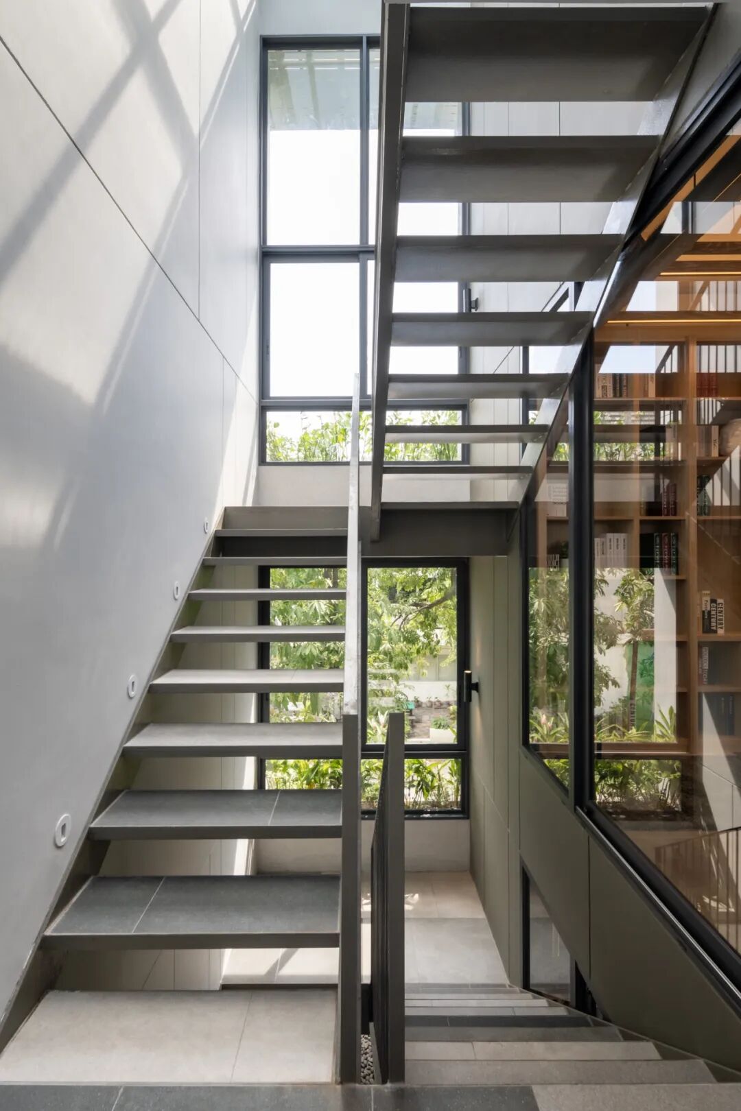 为了克服城市联排别墅的自然光线有限的挑战,空间和开口被用来吸引更多的光线进入建筑的整个空间。此外,为了创造不同楼层之间的连接,半室外楼梯井和垂直空间允许更多的开口,环绕生活区。楼梯上方的天窗和前玻璃为室内带来自然光,使空间感觉更加宽敞。