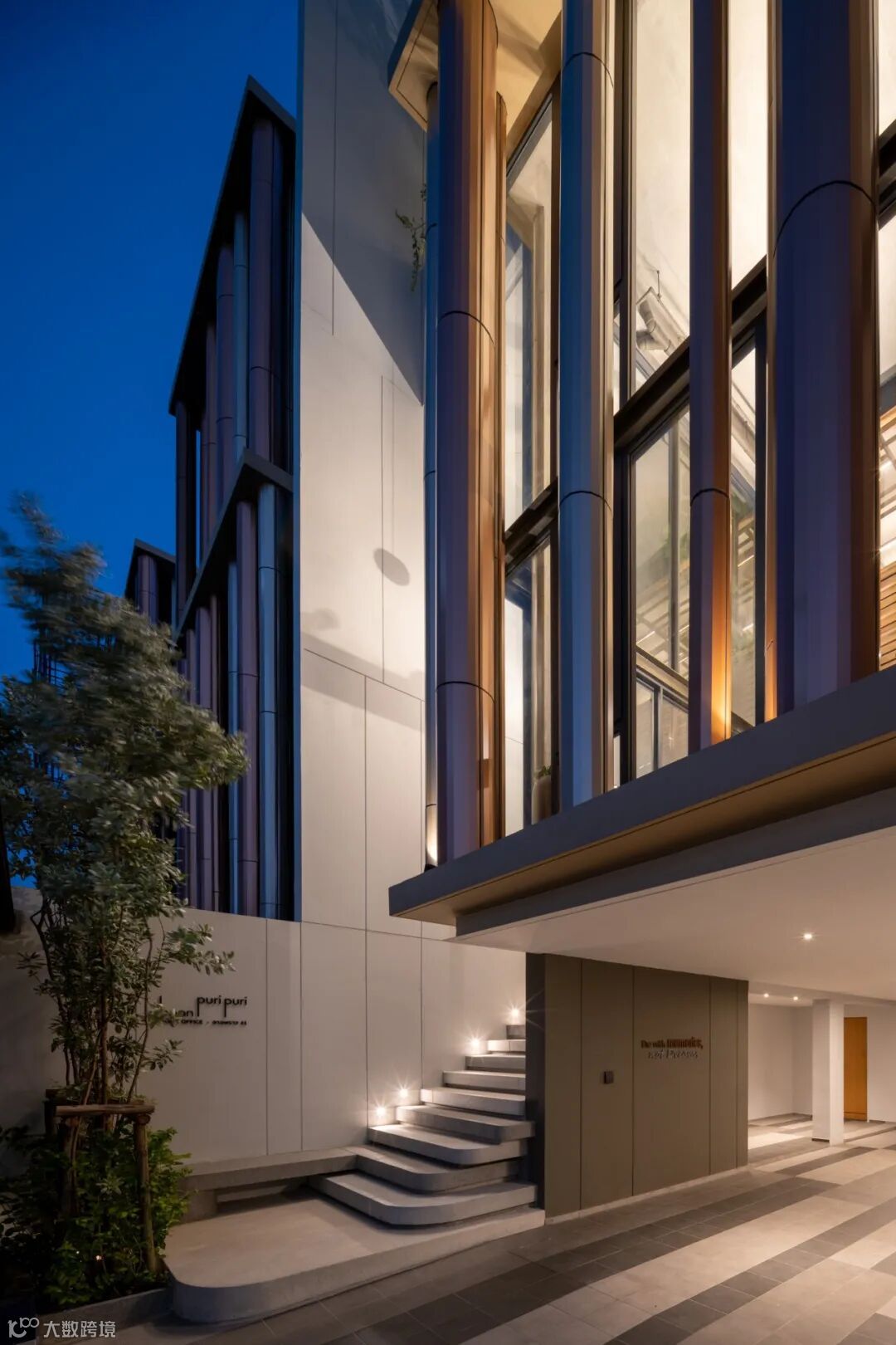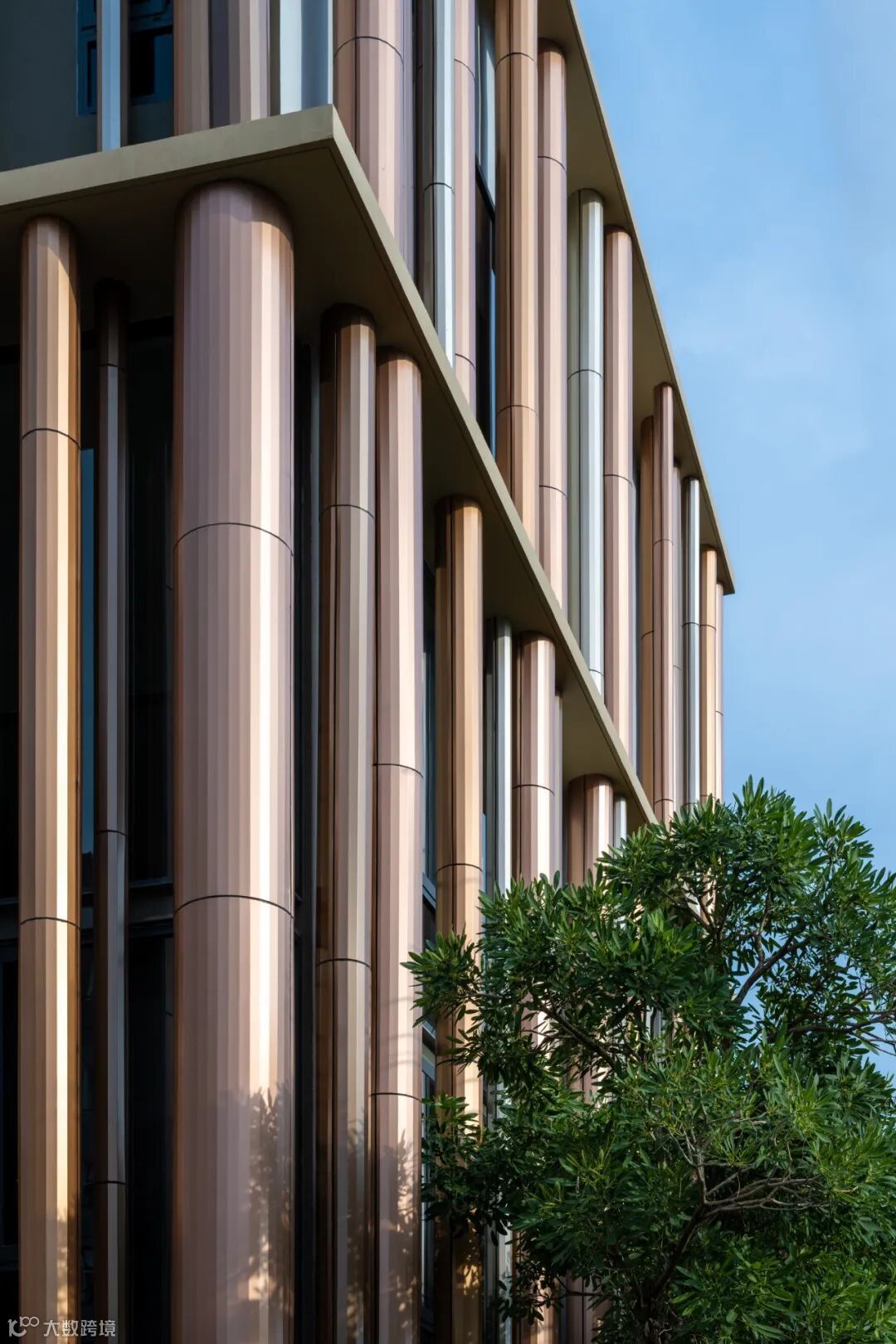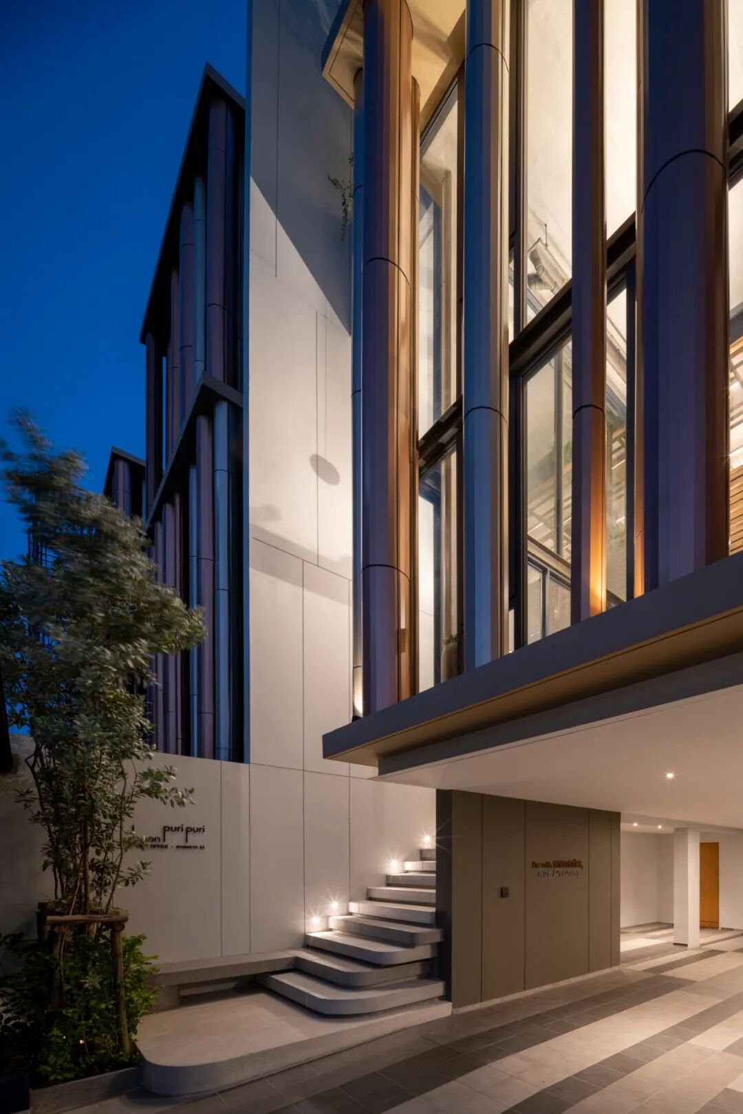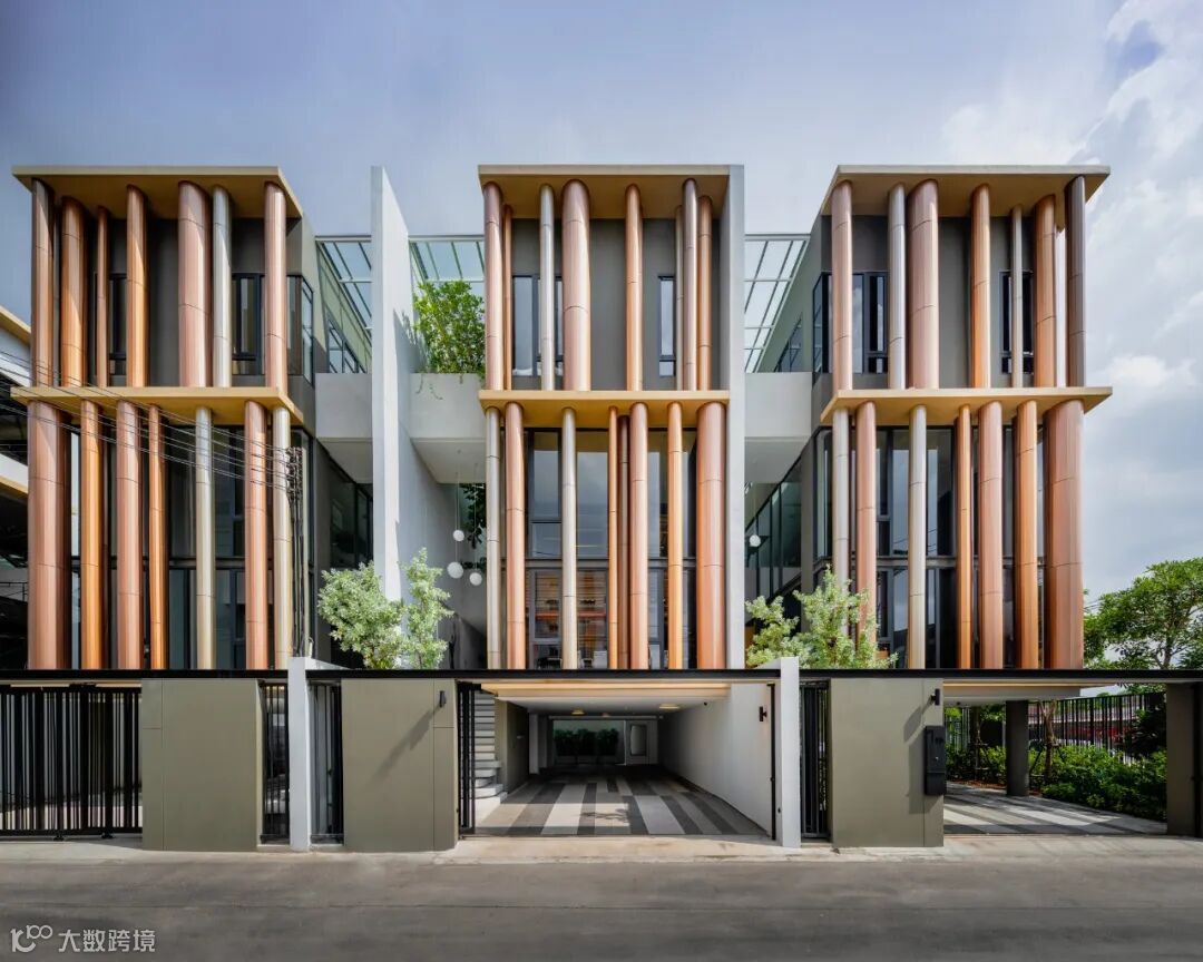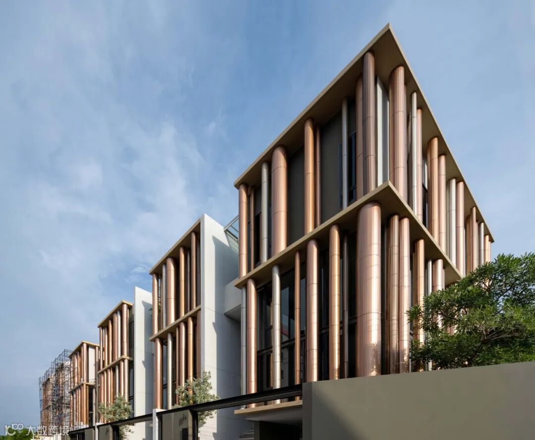 北立面的特点是一系列随机大小的铝包层柱。随着闪烁和彩虹色的效果,铜红色的渐变在柱面上创造了意想不到的感觉。同时也暗示了在泰国建筑柱廊模式中,角柱的凹陷特征;这与Baanpuripuri之前的项目有着相同的本质。这些柱子提供了独特的外观,并作为外部屏障,软化落在落地窗内层的阳光,提高生活空间的隐私性。