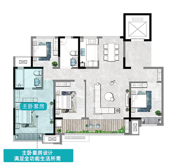私享空间:全功能主卧套房设计,更舒适的私享空间,融合休憩、更衣、梳妆、沐浴、观景五大功能为一体,拥有转角270°采光观景范围。