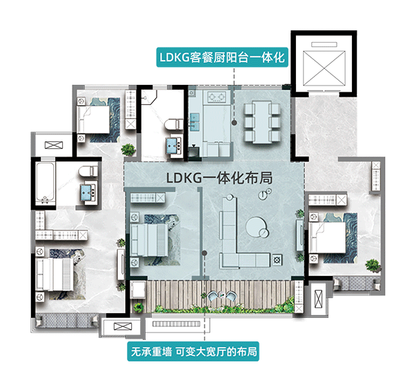 创新思考:现代型的客厅空间设计,打破了传统的功能局限。设计采用“LDKG”一体化空间理念,整个动区合厅居中设计,形成餐厅、客厅、阳台三位一体的居家空间,容纳多种生活场景。