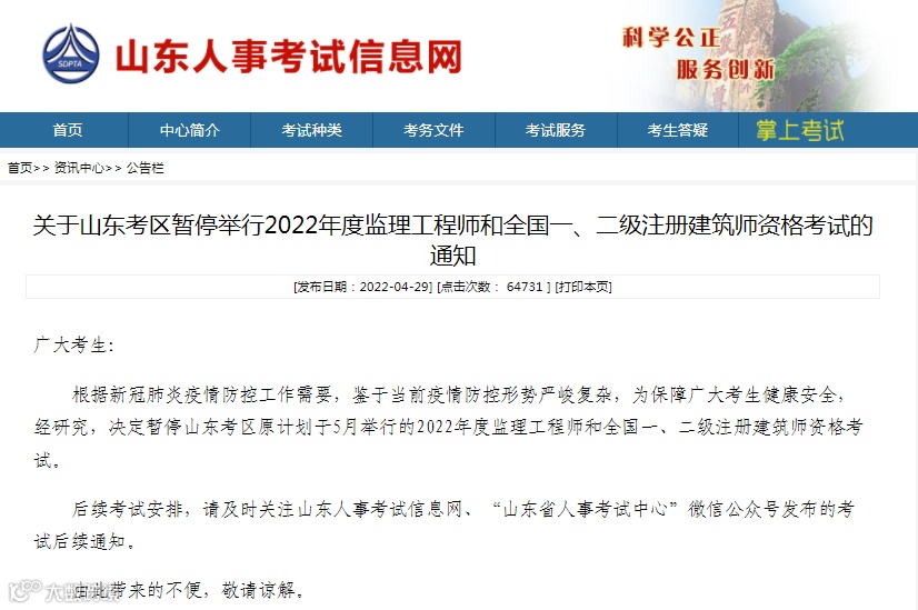 暂停考试公告地址:http://hrss.shandong.gov.cn/rsks/articles/ch03577/202204/eac1d1c3-b780-473c-94d6-5ebcebc25491.shtml