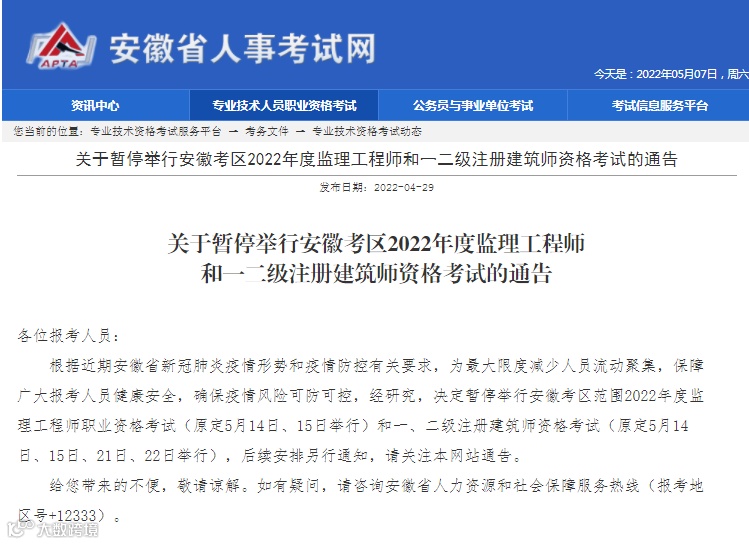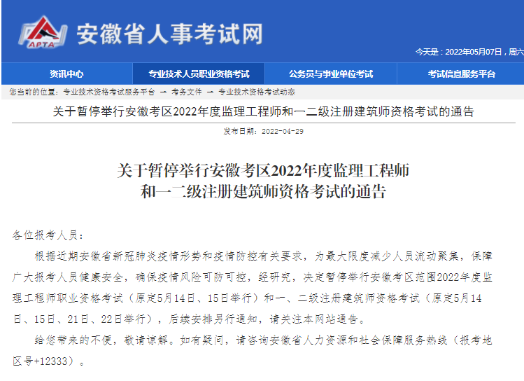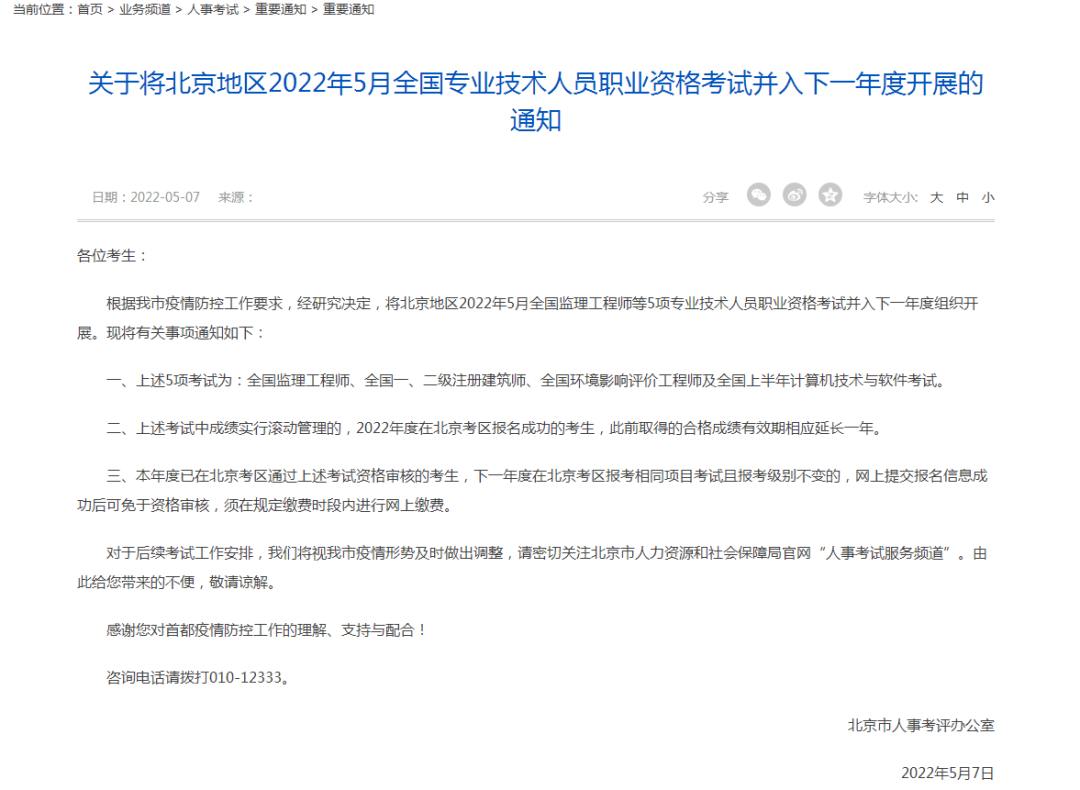 暂停考试公告地址:http://rsj.beijing.gov.cn/ywsite/bjpta/xwzx/zytz/202205/t20220507_2704414.html