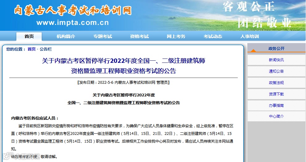 暂停考试公告地址:http://www.impta.com.cn/gonggao/202256120733.asp