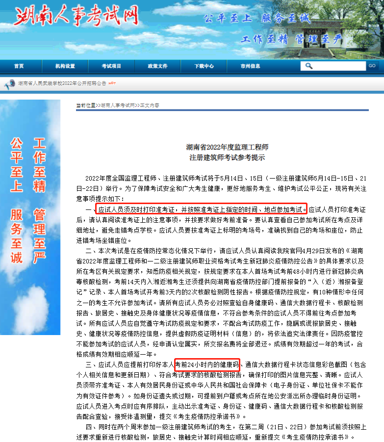 为确保各位考生能够顺利参加2022年监理工程师职业资格考试及一、二级注册建筑师资格考试,建议考生在“五一”假日期间,加强个人防护,避免前往上述地区和疫情中高风险地区以及所在市县(区),出行科学规范佩戴口罩,保持“一米线”社交距离,尽量减少到人员密集场所活动。请各位考生及时关注宁夏人事考试中心官网,查阅发布的《考生须知》,按照自治区疫情防控相关政策规定,自觉做好个人健康管理。