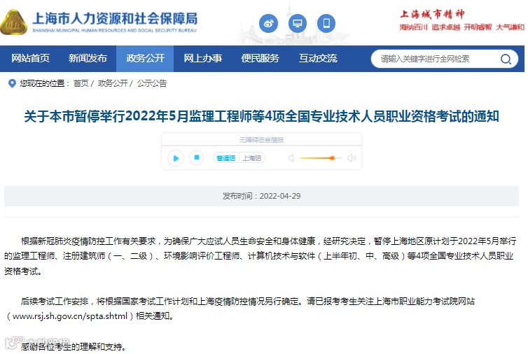 暂停考试公告地址:http://rsj.sh.gov.cn/tgsgg_17341/20220428/t0035_1406891.html