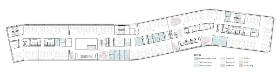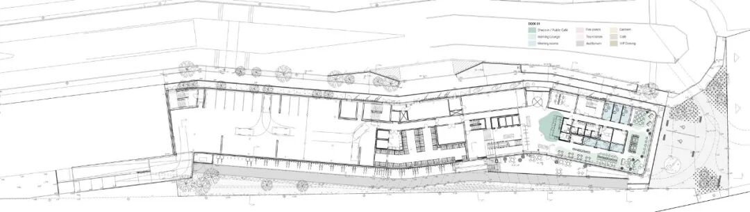 灵感来自于一艘船的结构,我们在底部放置了停车场,接着是后面楼层的办公室,最后是公共区域,如食堂、礼堂和会议室在顶部。因此,沿着建筑向上的旅程不断地通向新的、令人兴奋的目的地。”