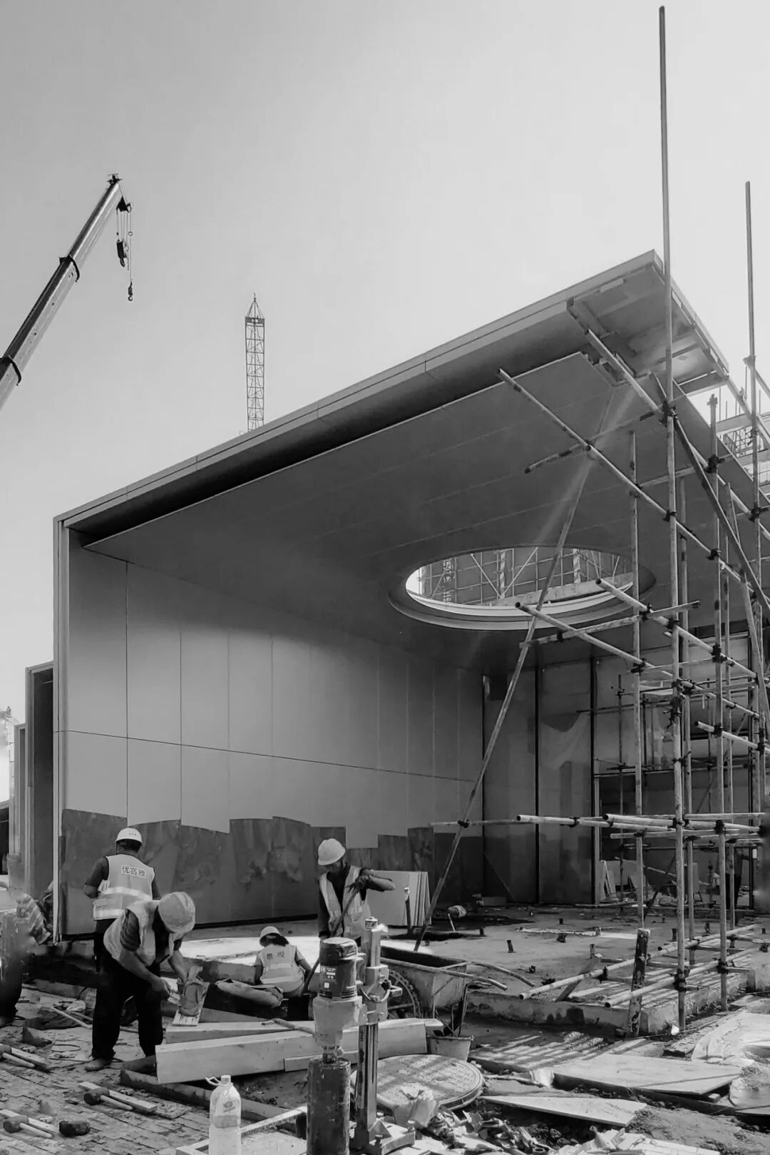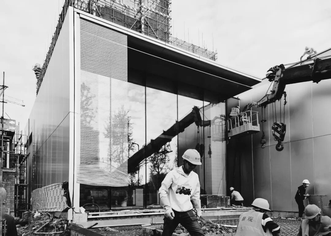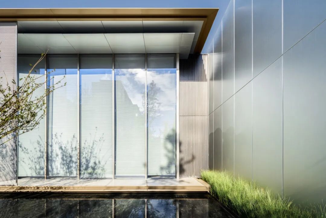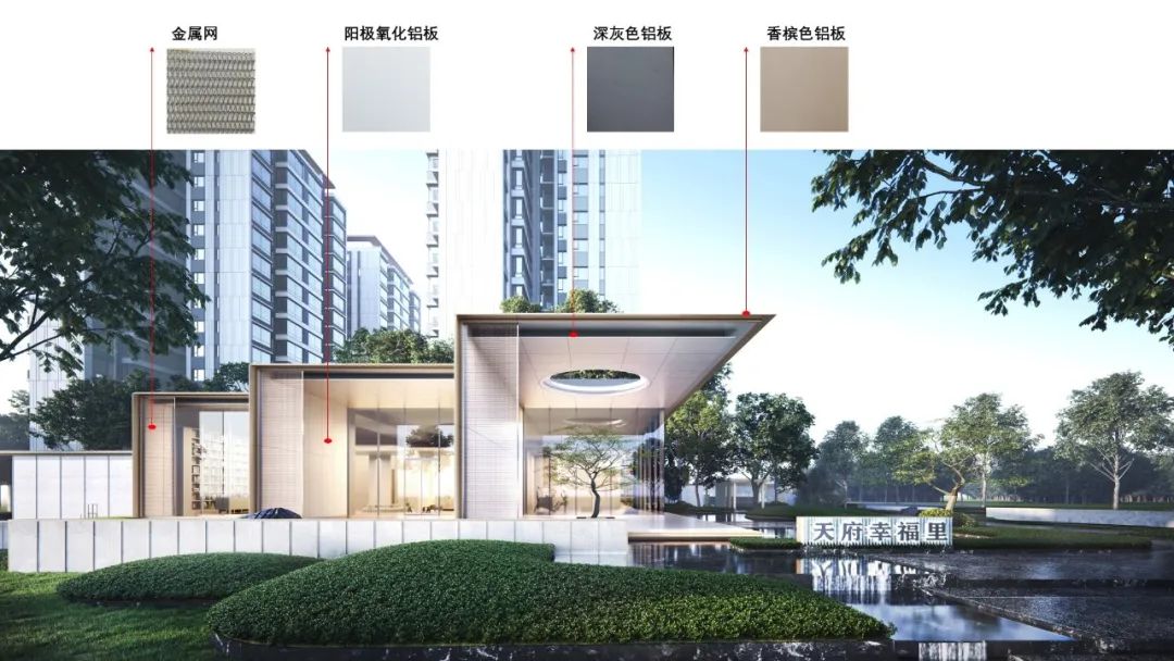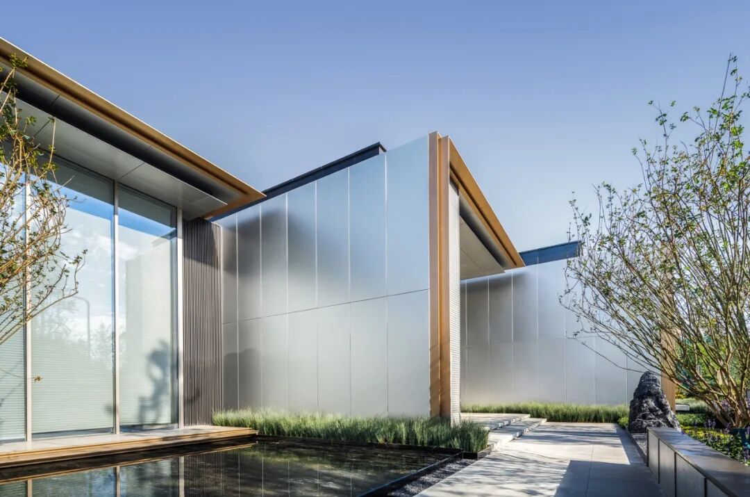 为了将空间感受更加直观地传递给参观者,我们更是反复考量建筑材料的选择,最终选择以内敛低调的银色阳极氧化铝,搭配尊贵高级的香槟色金属勾边作为点睛之笔。