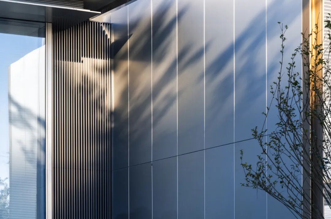 作为一种新兴环保材料,建筑立面大面积采用了内敛低调的银色阳极氧化铝,配以尊贵高级的香槟色金属勾边作为点睛之笔。在天空的映衬与光影的照耀下,阳极氧化铝呈现着如绸缎般细腻柔和的质感,形成近似水墨画笔锋般的浓转淡。以无与伦比的金属质感和色彩表现力,赋予空间全新的生命力与艺术感。