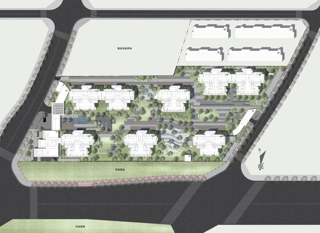 为保证居住的私密性,北侧商业部分独立成组团,在东侧设置独立人行出入口,通过巷道到达各单元入口,独立入户;商业业态沿城市主干道布置,位于高层组团西侧,承载起展示城市形象个性与满足生活需求的功能,从而满足私享品质人居和共享活力社区的双重可能,赋予空间满足多元生活的承载力和体验性。