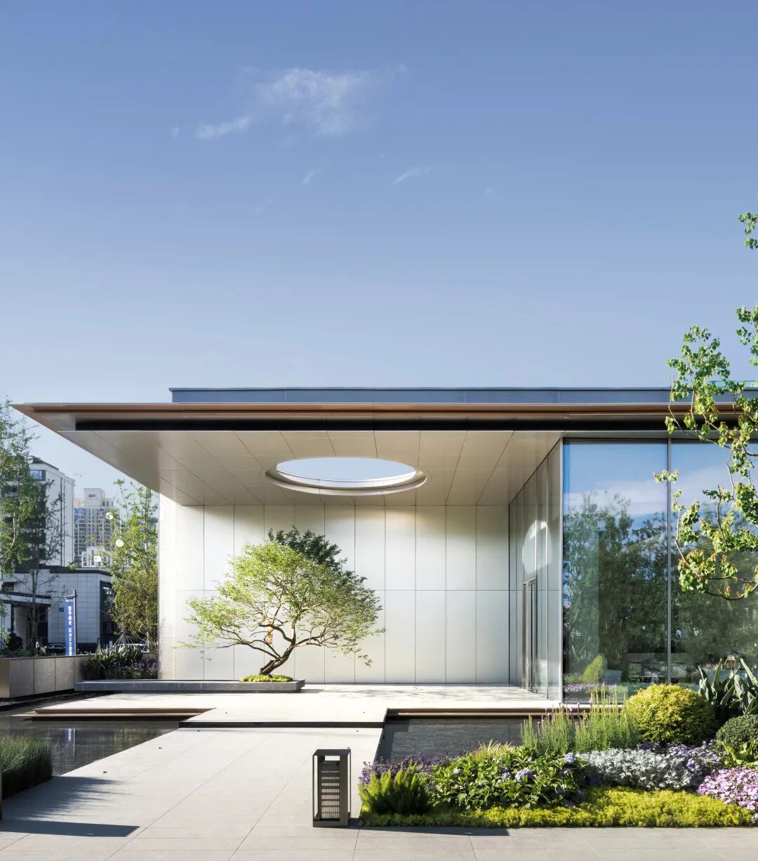 对于理想社区而言,真正的奢华属于“建筑、室内与景观的无缝融合”。示范区作为整体大区的缩微式尝鲜版,我们延用大区的设计概念,着眼于尺度的把控与韵律营造。整个示范区作为城市界面的标识性形象,空间格局就此打开。在入口灰空间的处理上,设计充分回应了宋式美学对空与透的追求,留白的圆形穹顶下矗立着一株翠树,自然形成一幅天人合一的禅意野趣之景。