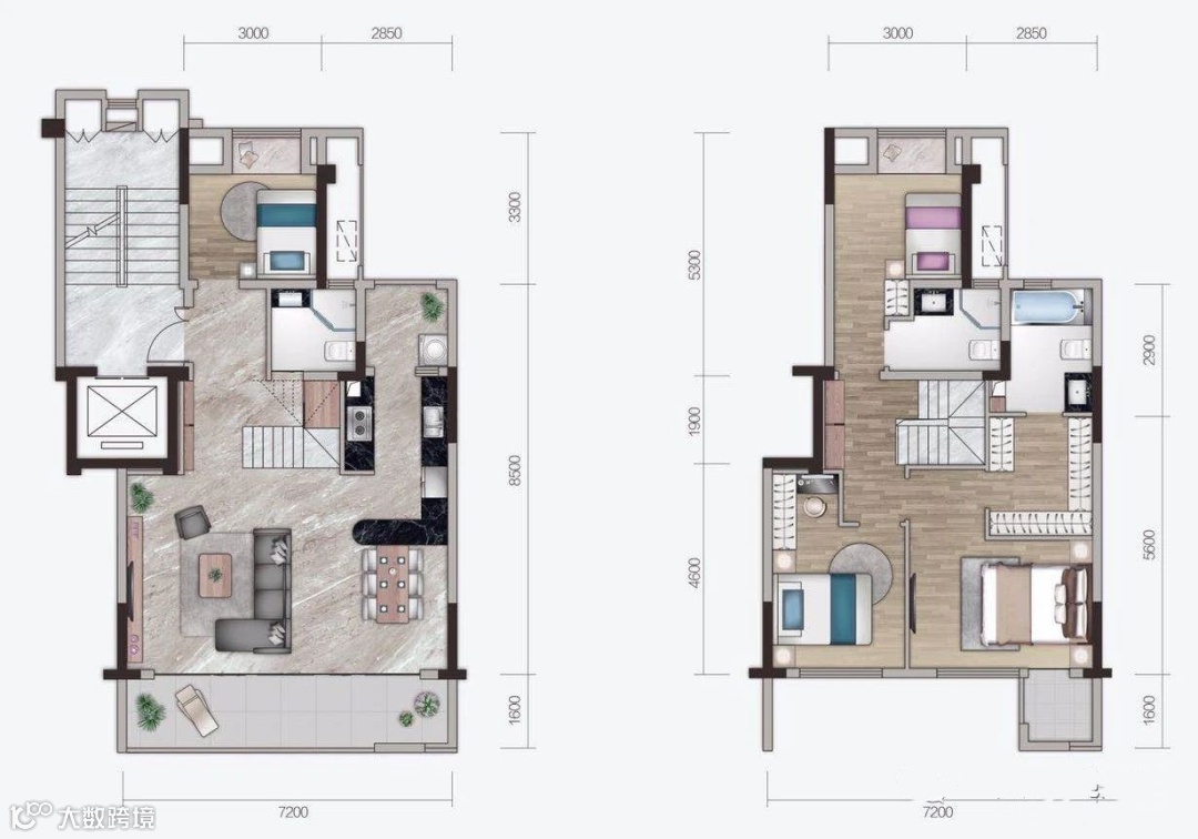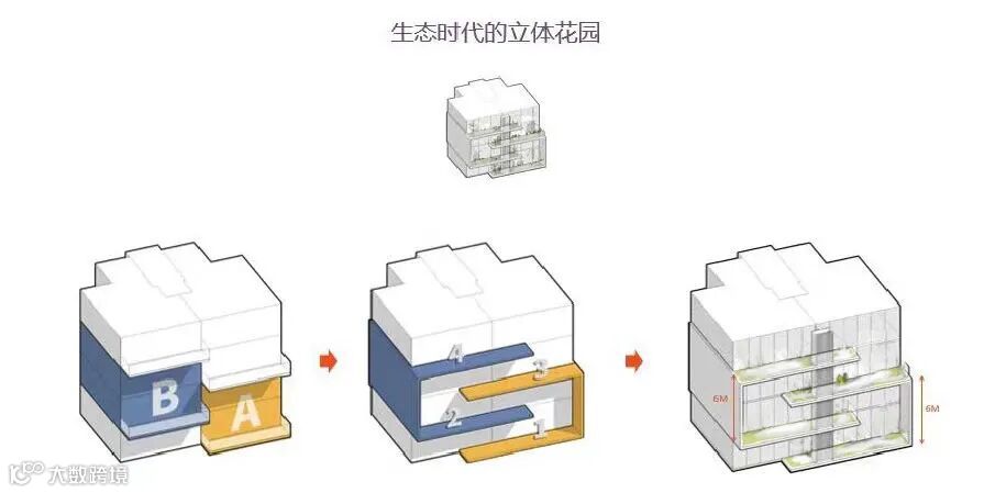 由此,这两年的创新产品有一个趋势,那就是将别墅立体空间的平面化,将别墅的院落、空中花园等元素在平面空间内实现——采用错层阳台及局部挑高方式,营造一种空中花园的别墅居住体验感。