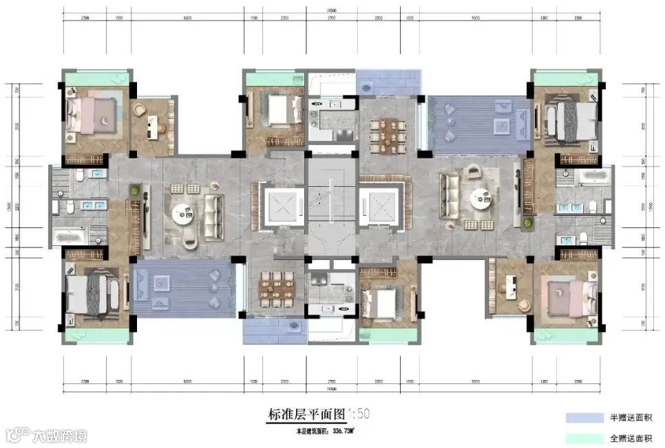 未来天奕,整体布局共5栋楼,主力户型是建面约218㎡和288㎡的四房。