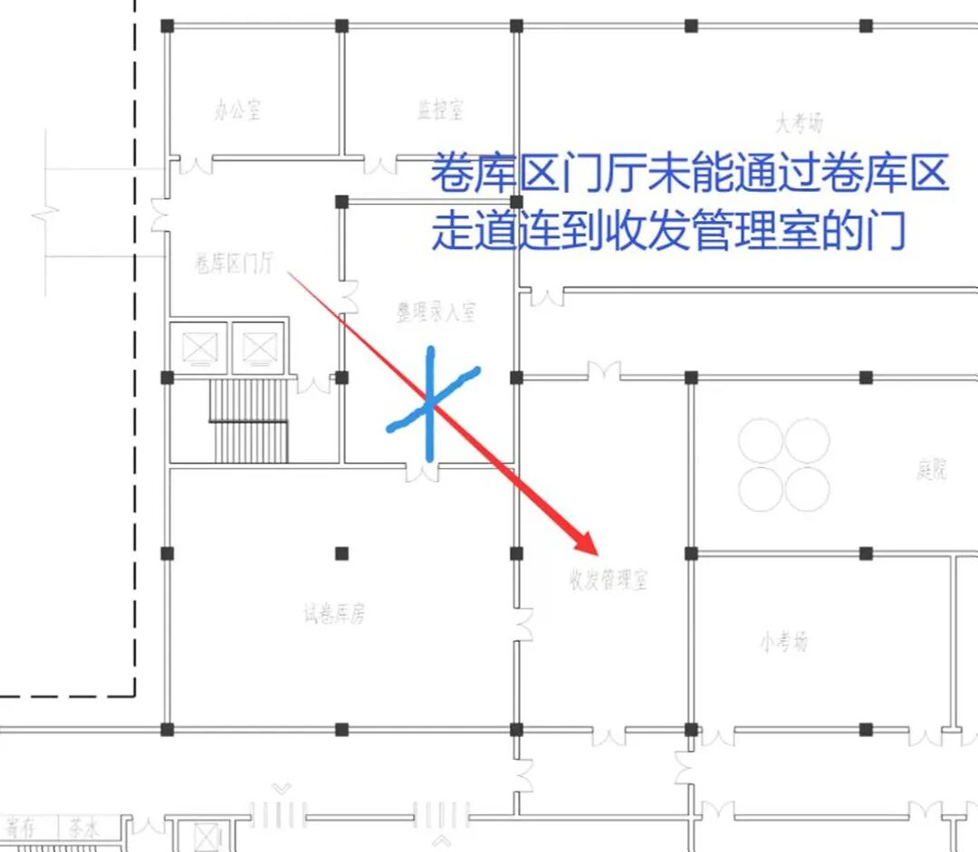 其实小考场一字排开并不会造成功能上的问题,所以这里不扣分。当然我们经过研究认为,标答很可能是小考场两南两北布置,但这并不意味着一字排开会扣分,因为没有产生功能上的问题。