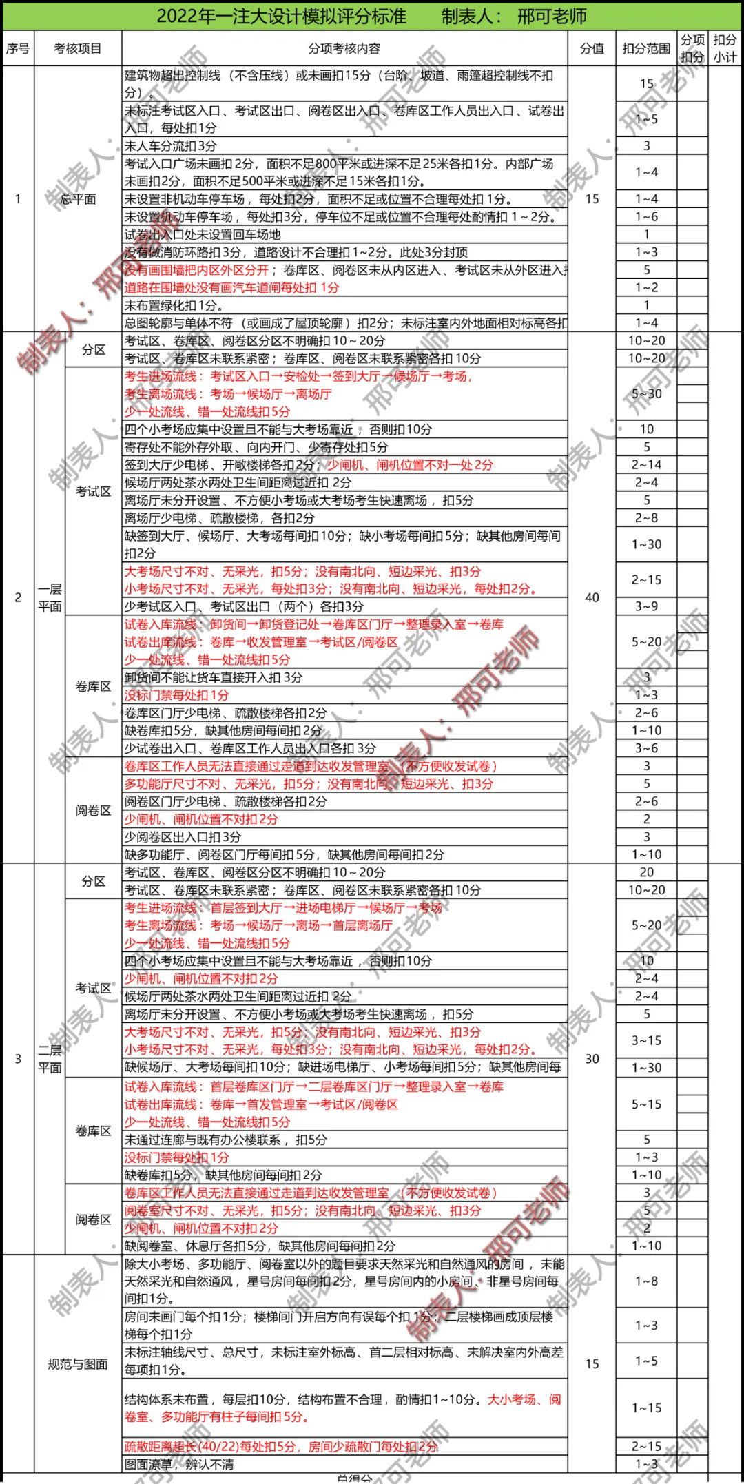 今年的题目,无论是从文字描述的语气,还是面积表的格式、气泡图的格式和表达特点,都保持着前几年出题人的一贯风格。按以往的评分标准,我给大家整理了2022大设计模拟评分表。红色字的部分是今年的一些重大扣分点,大家也可以先跳过表格直接看我后面的重大扣分点分析,再回来翻看表格。