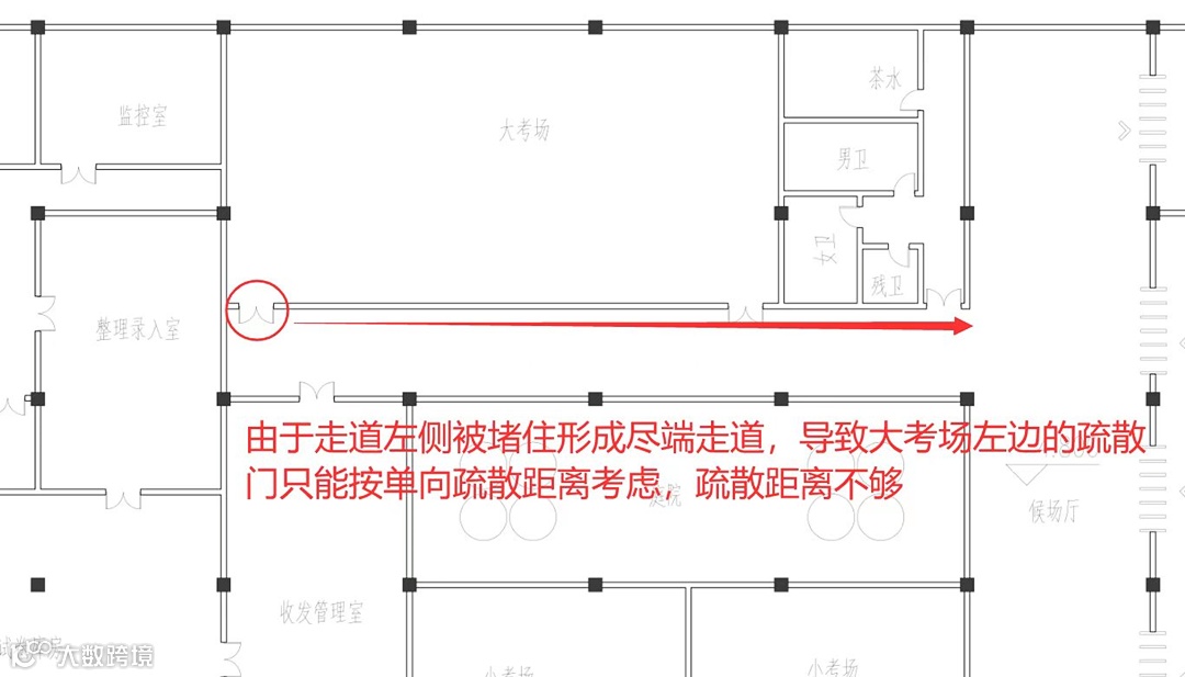 疏散距离不够历年都是5分一处,也算是扣得比较多的扣分点。这道题有一些同学容易在中间把走道打断,形成袋形走道,这样就很容易疏散距离不足的分数。