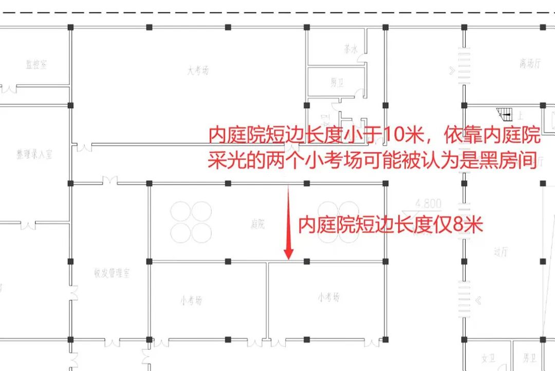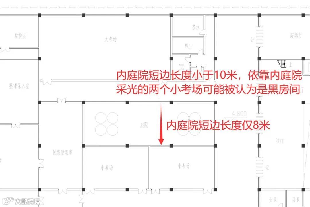 所以出题人在这里应该是放宽了,只需要庭院短边尺寸大于两层建筑高度,大概是10米,就不扣分。如果庭院短边只做了一跨8米,那可能用这个庭院采光的房间都会被当成黑房间扣分。