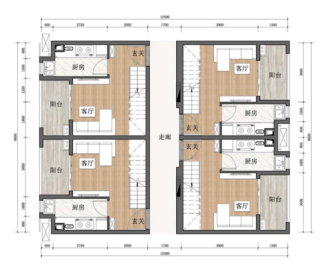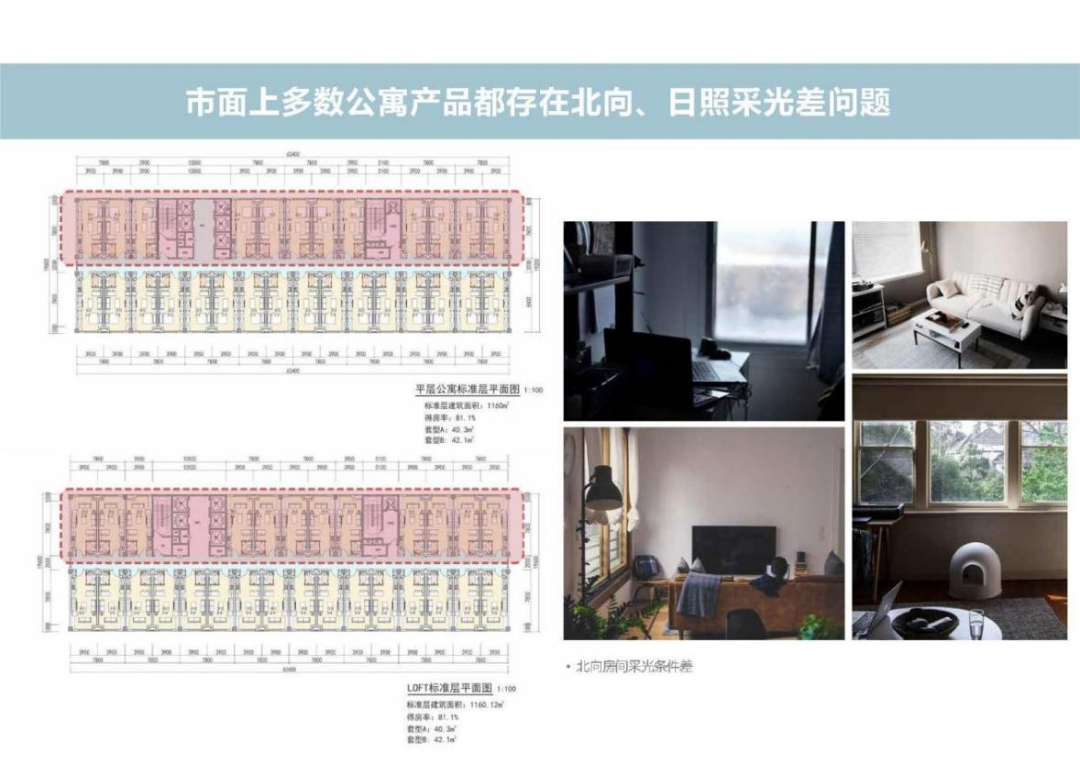 传统的租赁住宅产品普遍存在户型北向与西向日照差、通风不好的问题,为此我们创新引入了“X型”的两层错叠的户型组合形式,并将此户型集中放置在在东西朝向的楼栋中,使建筑日照和通风问题得到大大改善。“X型”的布局形式使双层的两户只使用一条公共走廊,减少了公共使用面积,大幅提升了项目得房率。