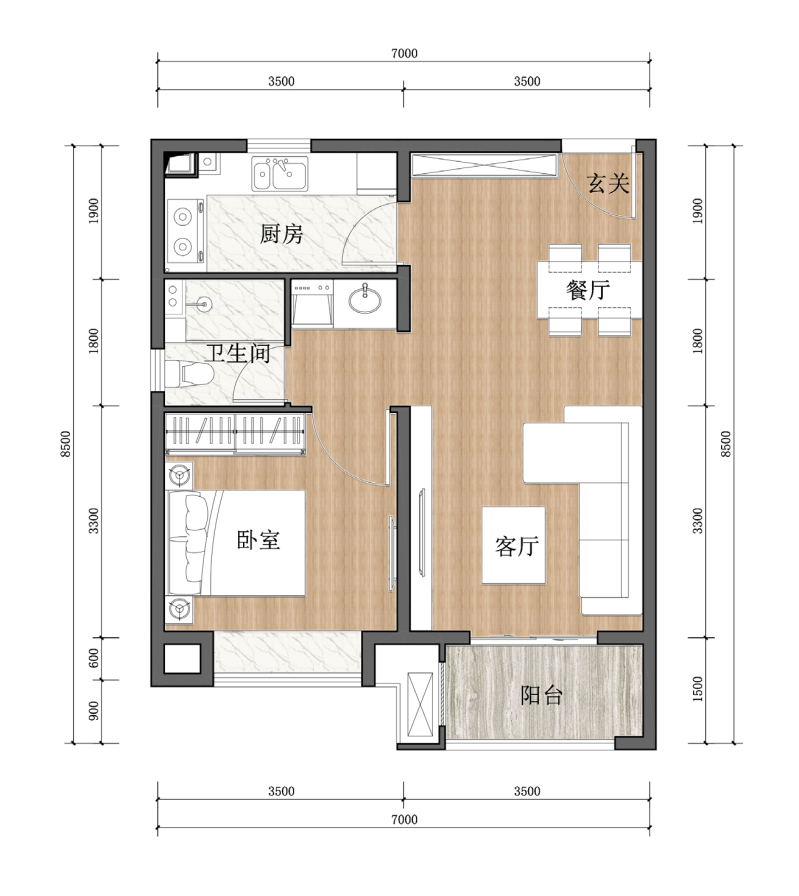 在户型内容设计上我们希望可以在一室的小户型中满足年轻人对生活中仪式感的需求。独立玄关、封闭明厨、干湿分离卫生间、独立卧室这些功能空间的合理布局,使得日常生活、朋友聚会读书观影等活动都能以舒适的方式展开。