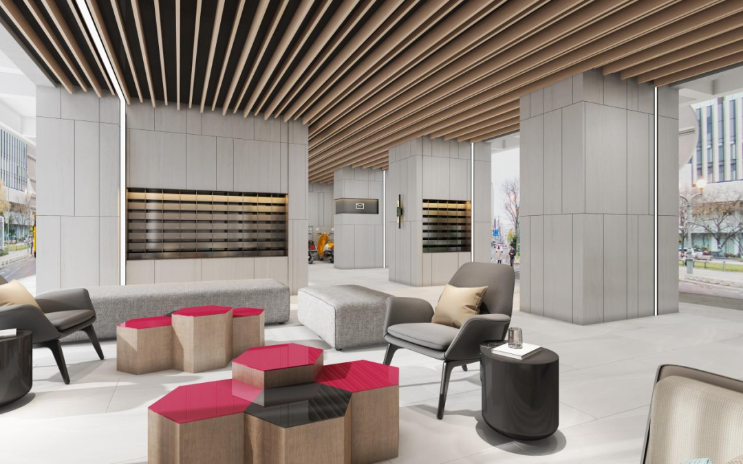 公区部分的设计从天花高低起伏的格栅到墙面错落不规则的石材铺贴,都增加了整个空间的灵动性及趣味性。此外我们还在整个公区做了很多小细节来提亮整个空间,像非机动车区域的小导视,还有我们信报箱和墙面的线条灯的结合,以及相应的这些人性化的摆台。