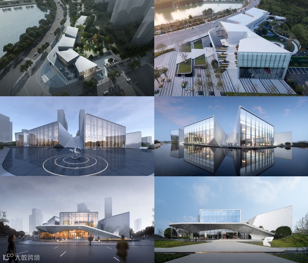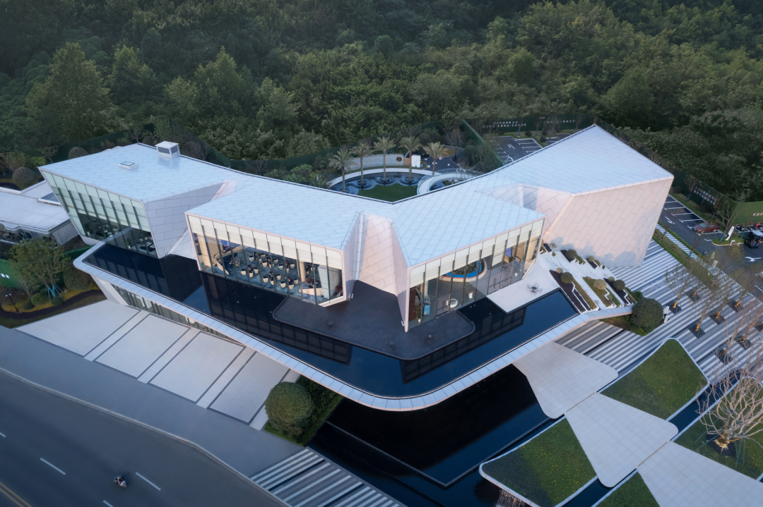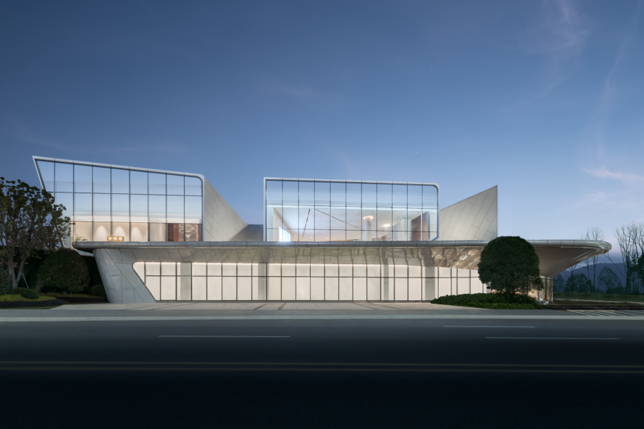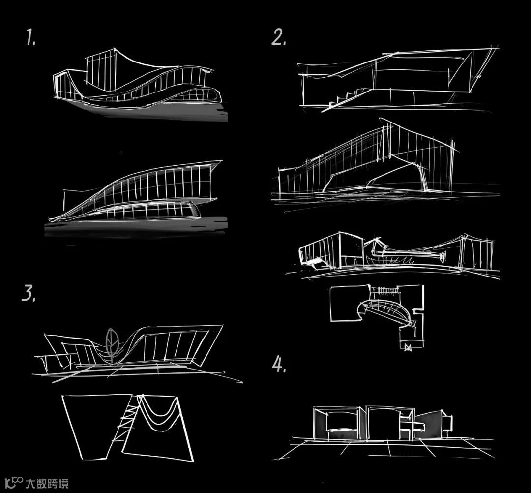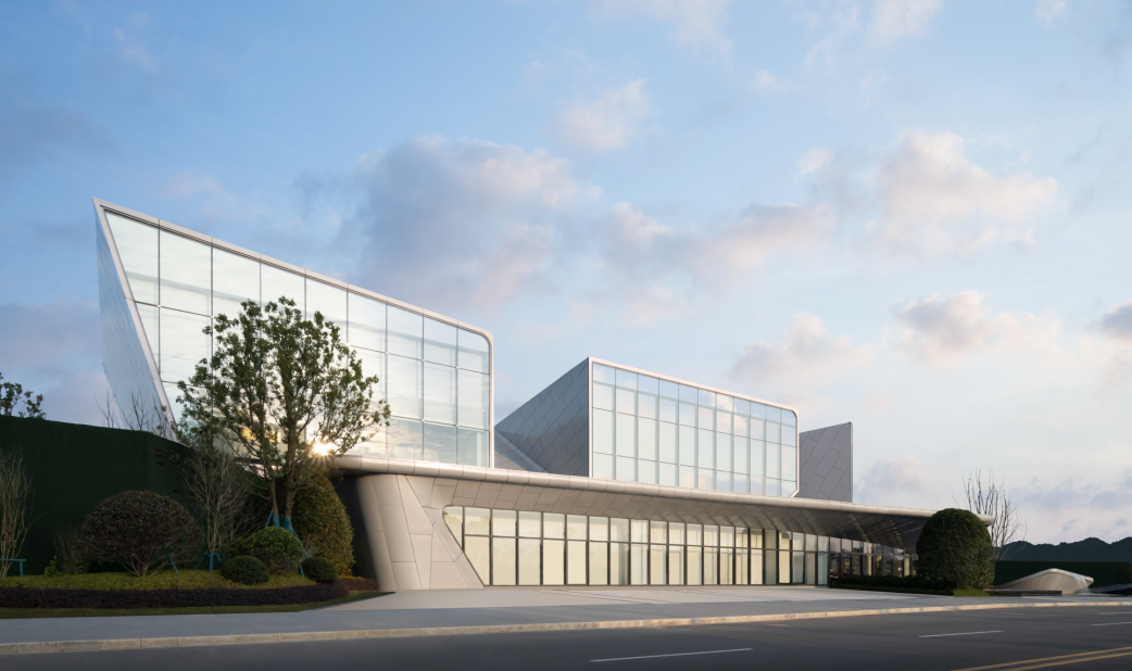 基于利用景观资源和展现工业美与科技感的考虑,我们尝试了多个方案,以宽敞明亮的落地窗和流畅简洁而有力度的形体为基点进行探索,提出了“林间溪”、“浪花”、“四水归堂”等设计思路,最终选择了以“科技方舟”为概念的方案。