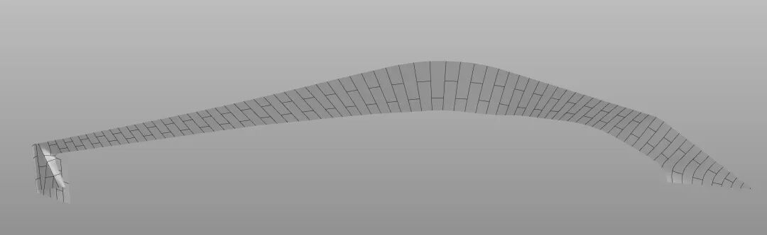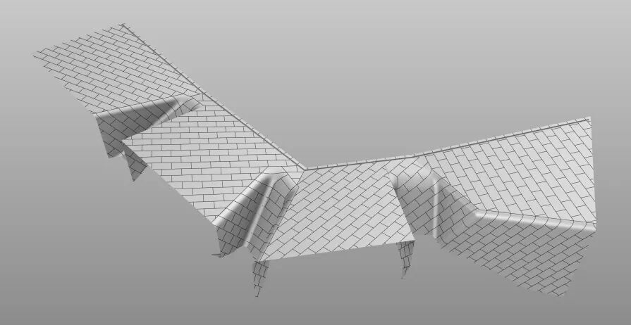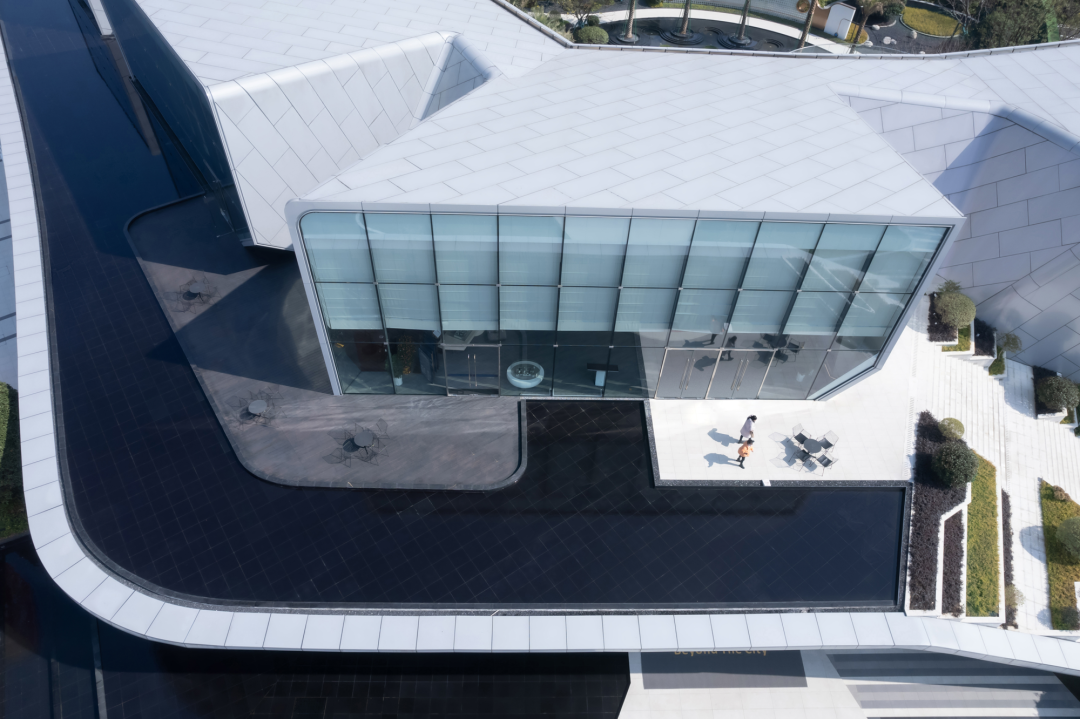 具有工艺感的倒角构成了二层的池水平台,铝板具有良好的韧性,设计调节二维曲线和三维曲面以达到好的效果,组成双曲面的铝板每一块都不同。