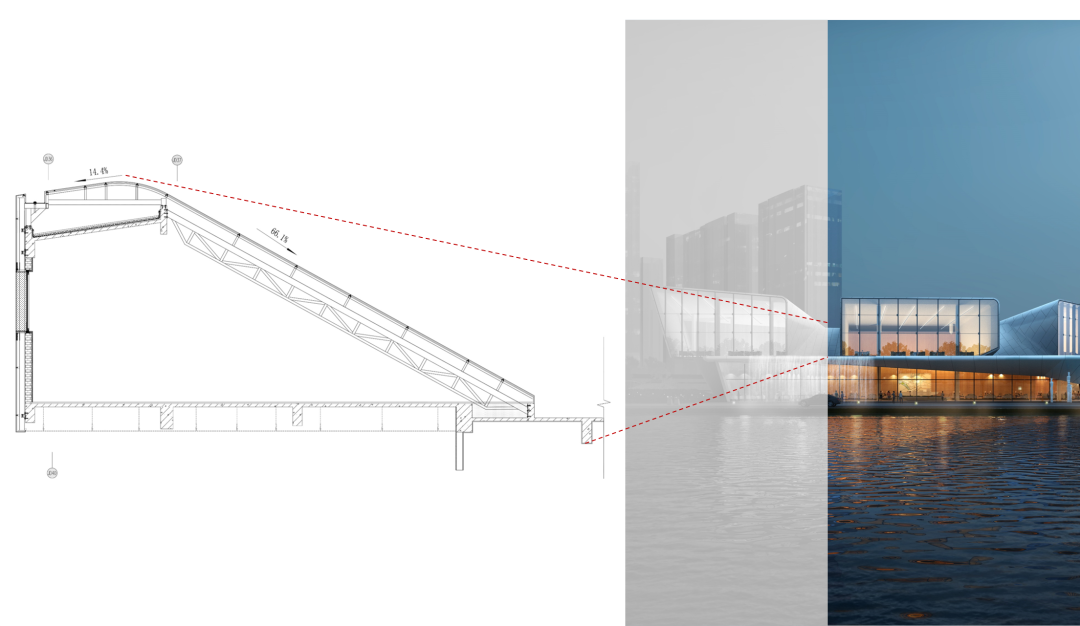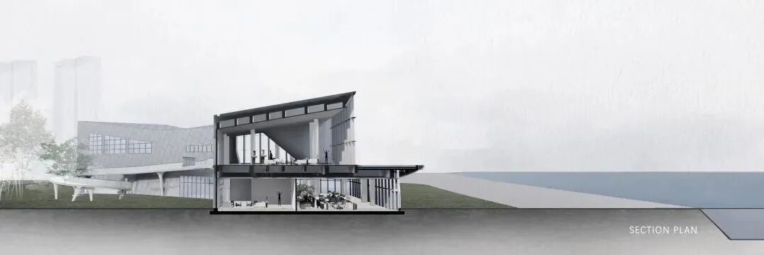临于水畔的建筑物让人想到园林建筑中的“水榭”,铝板与玻璃幕墙构成的立面造型是现代化技术对于传统建筑观的精彩转译,既符合水榭建造所要求的轻快通透,通达舒展,与环境相融,与水景相宜,同时又是实际存在的分隔,满足建筑物的功能需求。