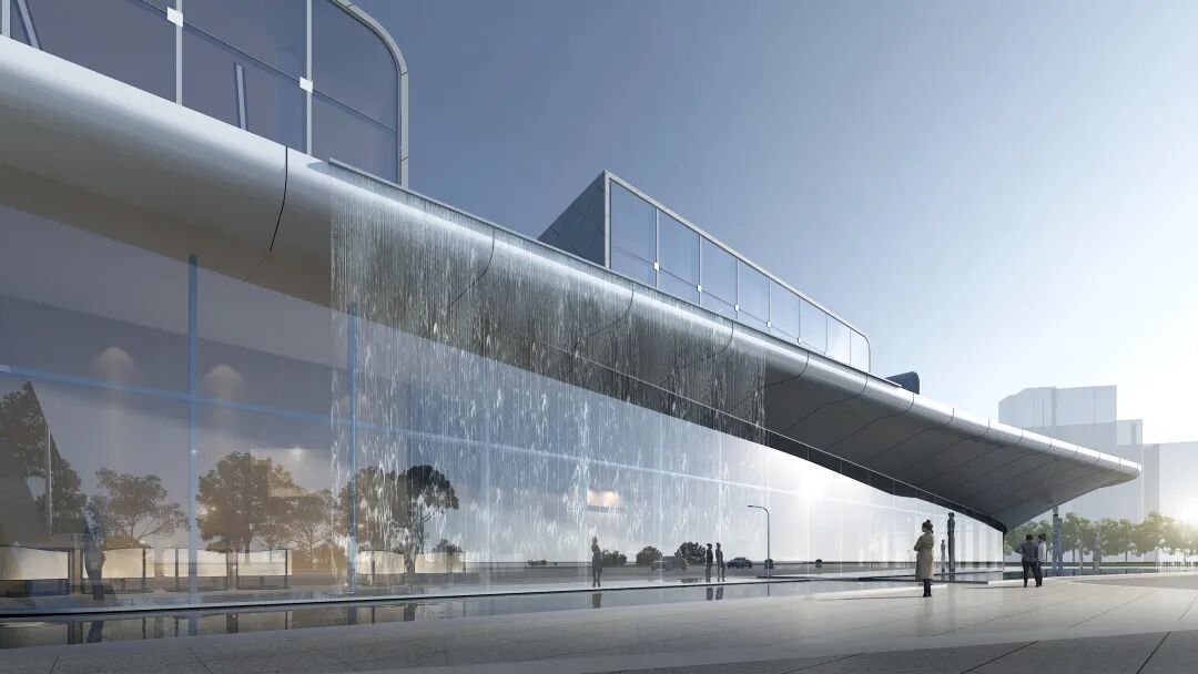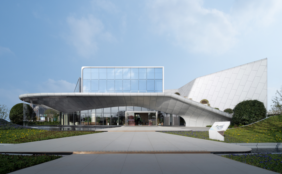 建筑自远处眺望,仿佛浮于水上的科技方舟,色彩纯粹的金属外壳融入到水天一色的环境中,近看形体则如同波浪,水景水幕围绕包裹,整体营造水的故事,打造水上方舟的形象。