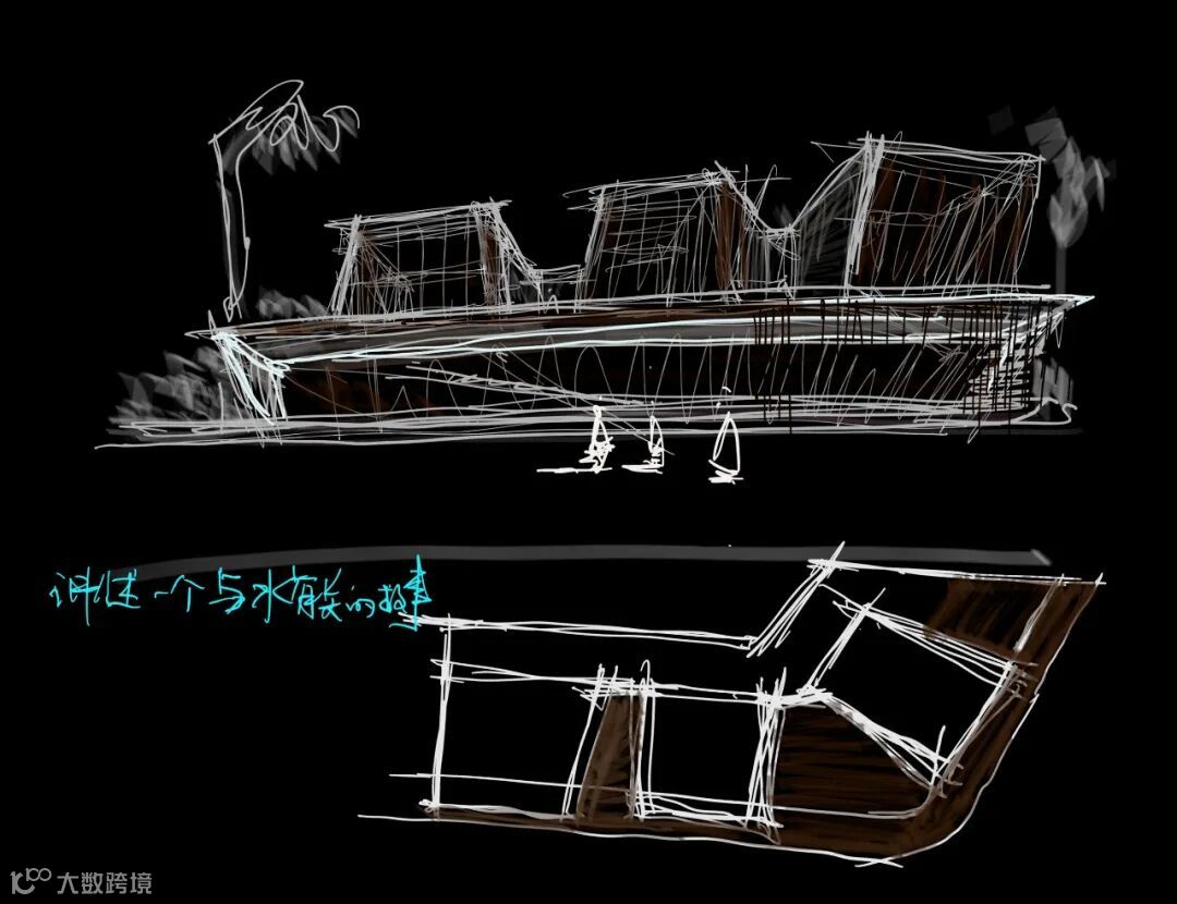 从入口处观,环绕主体的平台使外形具有一种科技方舟的概念感,拾阶而上,二层平台的设置既为观景者提供了一个亲水活动之处,同时也让自水景而望的观景窗所见景致更加纯粹。通过设计加强了空间的特质,使得场所精神更加突出。
