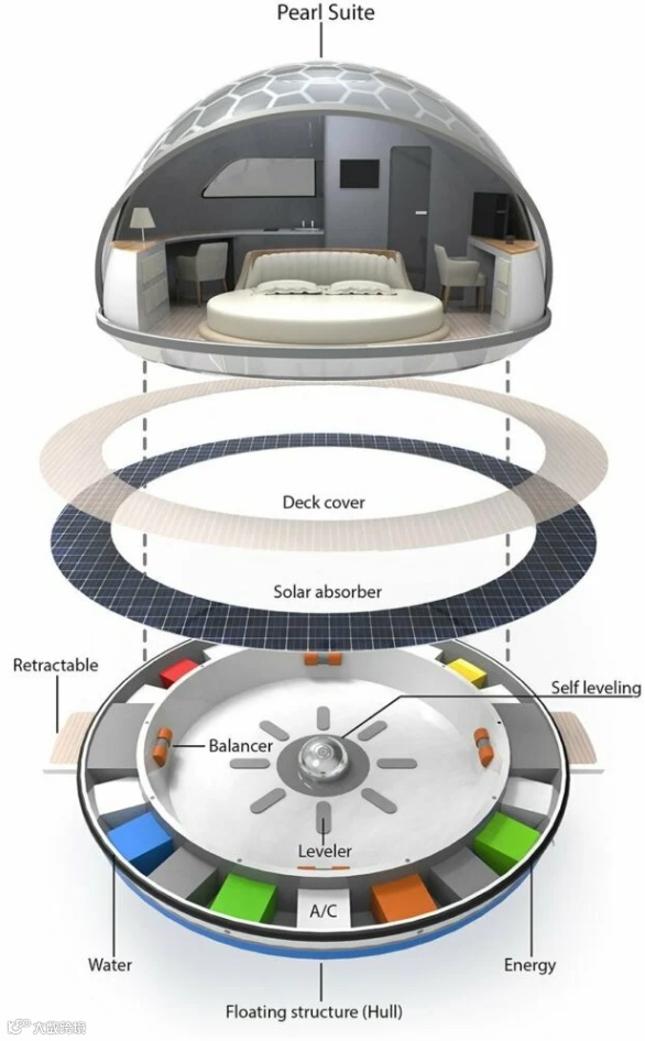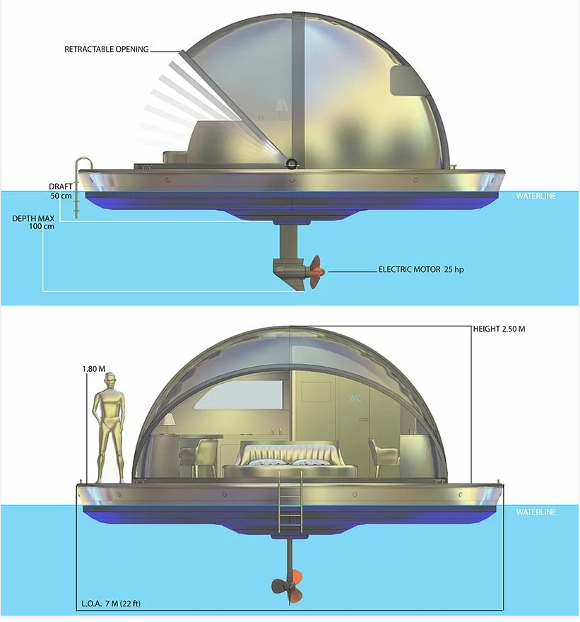 这些单元将采用最现代的航海技术建造,基于与圆形船体相连的强制主壳。在应用技术、可持续性和创新内容方面,Pearlsuite 展现出多重特征和可能性。事实上,这些套房可以配备电动发动机,因此能够根据先进的 GPS 定位系统和自动驾驶仪功能自行定位或以 5 节的速度从 A 点巡航到 B 点。