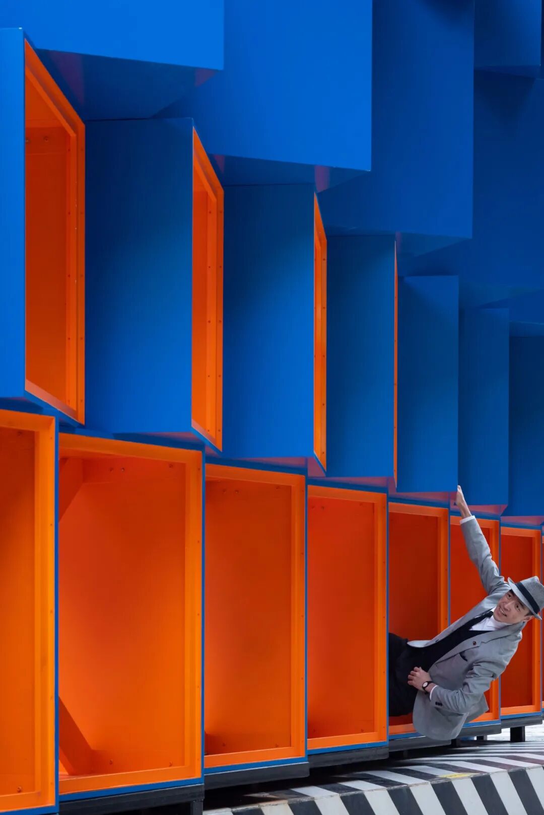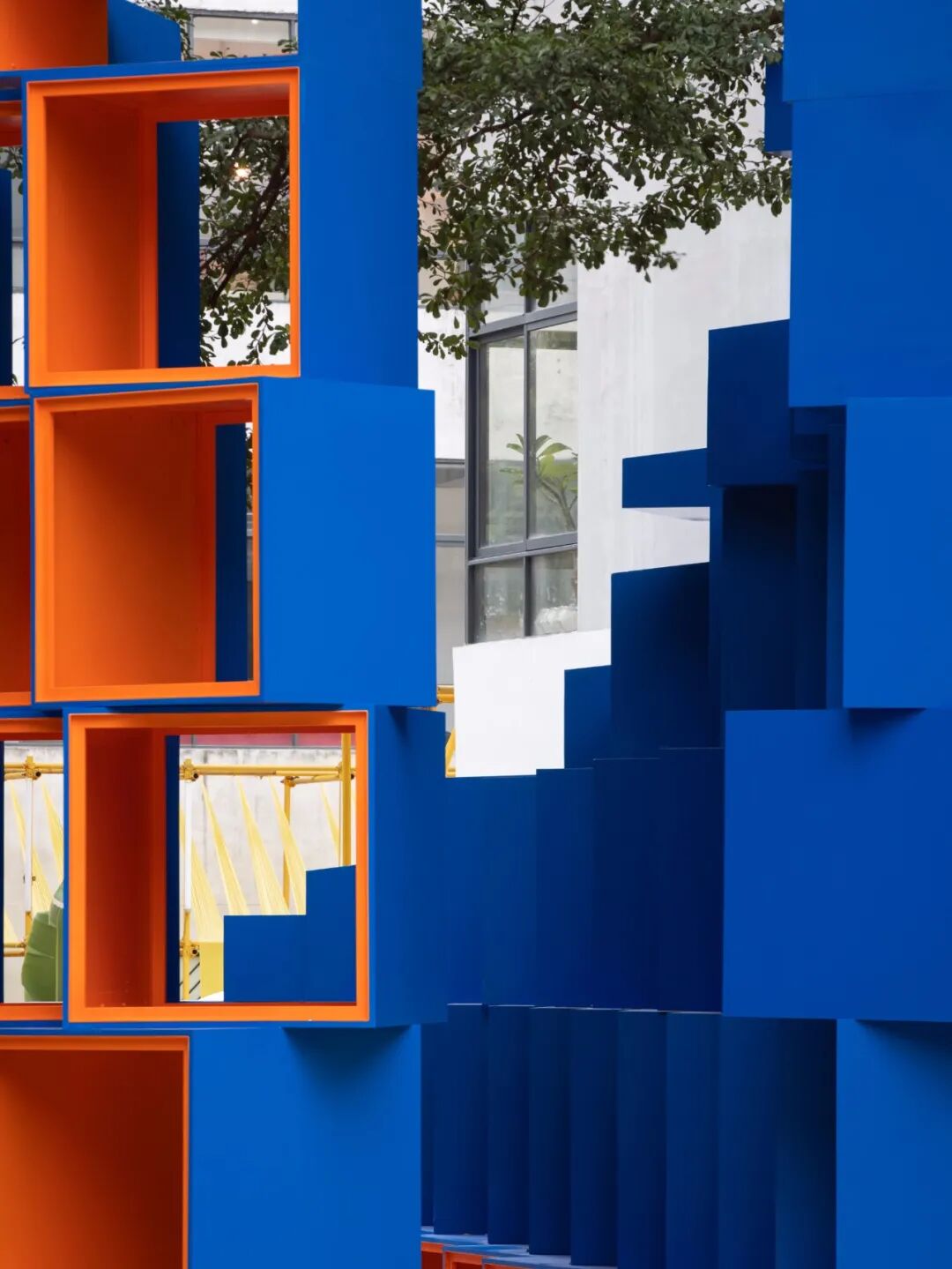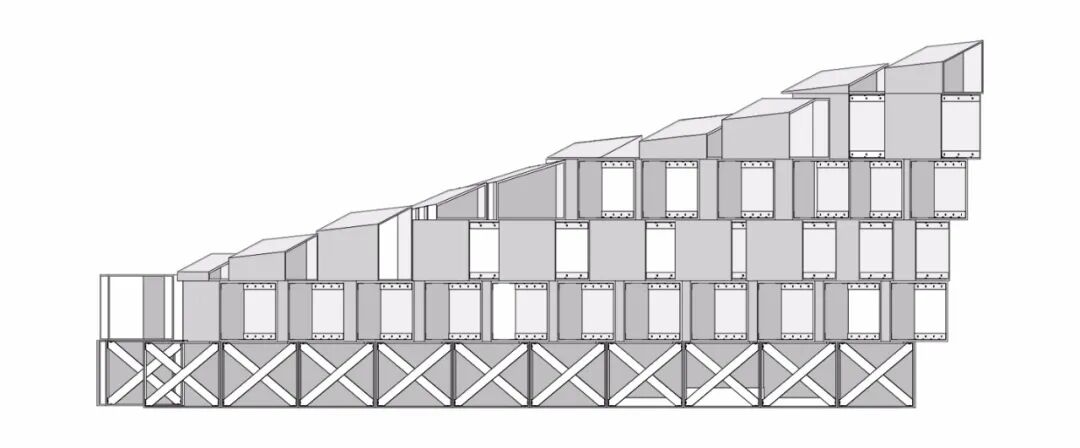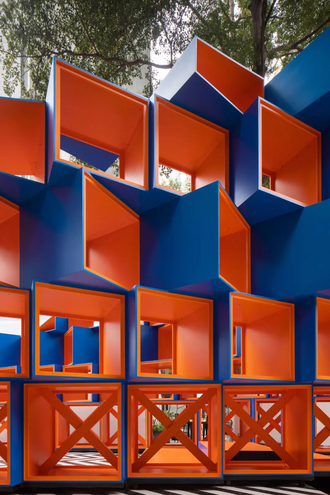 诺亿设计研发创始人王左千形容到:“这是一个非常有趣的搭积木过程,当吊车师傅挑起积木模块,我们在现场还可以进行即兴的调整,我们要建立的不是一个单一场景,而是建立一种立体的互动关系,这样才能让周围发生的故事更加生动,更有叙事性,构成了一幕一幕生动的画面,98个盒子就是承载了98个故事,这就出现了丰富的人物关系和剧场感。”整个Pavilion是由98个预制模块组成的,主材料只有两种,使用雪佛板和最少量的钢结构组成,可以灵活进行打配和组合。材料本身具有很强的耐候性,满足长期在室外使用的需求,重量非常轻,无需重型机械安装,只需要少量技术工人和一架轻型吊机就可以在24小时内组装完成。