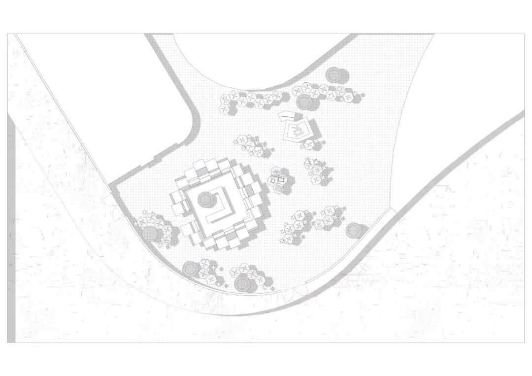 它看似是不完整的建筑,仅仅保留了墙体元素,但其实它既是墙体又是柱子,同时也是窗户,地面则是直接使用了场地本身历史遗留下来的黑白砖,“屋顶”则是空出的天空,因此,他具备了建筑该有的基本元素,并抽象化地表达了叠加与打补丁的概念。墙体和柱子是组成建筑的基本元素,并和周围的城市产生一个对话。