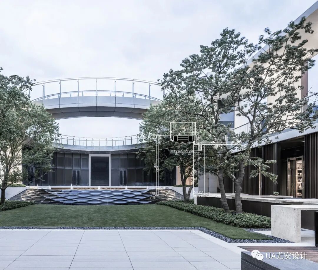 穿过大堂,承载“室外课堂和舞台”属性的下沉庭院映入眼帘。悬挑20m的牛顿桥上及其下方平台是可供演出与分享的星光场地,大家可以坐在大草坪上及两边的座椅上欣赏精彩的讲演。