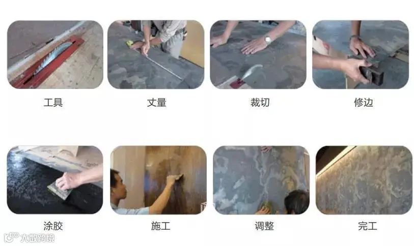 施工流程为:丈量→裁切→修边→涂胶→施工→调整→完工。