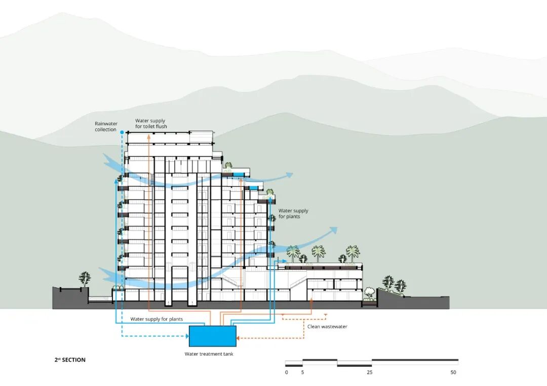减少墙体窗户的比例,在外墙使用反光涂料,以及屋顶和外墙的保温也有助于减少能源的使用。污水处理系统(100%的生活污水被处理并重新用于灌溉和冲厕,进一步培育了绿色植物本身);由于采用了上述可持续发展方法,该建筑获得了EDGE高级绿色建筑认证,因为它能够减少42%的能源、22%的水和36%的建筑材料使用,建立了一个世界知名的内外绿色地标。
