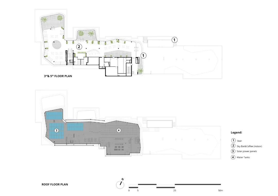 该建筑的典型节能特点是应用自动通风;省电的VRV空调;感应式LED灯、太阳能和热泵系统。此外,"空中森林 "的设计采用了夹层/钢化玻璃系统,将屋顶和墙面的玻璃结合起来,最大限度地利用自然光,因此减少了白天的电力照明需求。