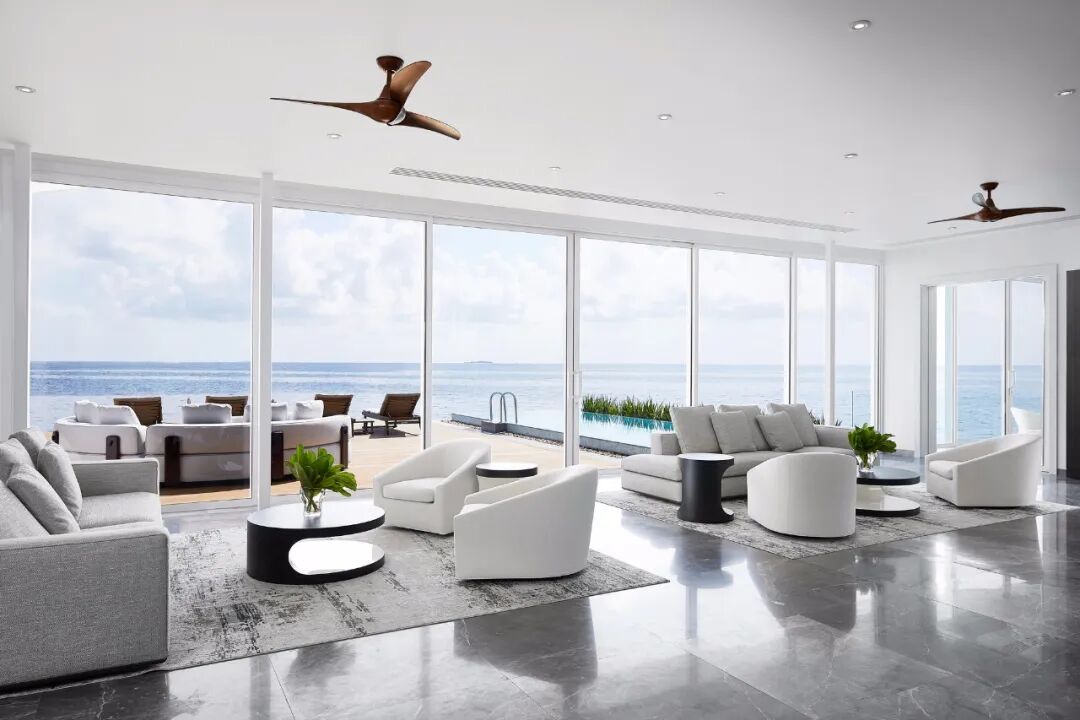 More than half of the wall and ceiling surface is covered with 7” thick clear acrylic to visually connect the outside and the suite. The underwater spaces span 100 square meters and are accessed through the spiral staircase and an elevator from an overwater living room. In order to minimize the inevitable appearance of heavy steel and concrete, the majority of the interior spaces are upholstered with leather, and the floor is covered with carpet, with which, sound reverberation is also minimized.