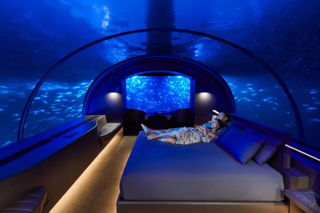 The interior design and much detailing of finishes were inspired by airplane luxury cabins. Every part of the interior was carefully measured, modulated, mocked up, and installed. Despite the fact that this is the only underwater bedroom in the region, automated privacy screens are integrated into all windows and controlled with a tablet in conjunction with a lighting system, similar to ones in luxury airplane cabins.