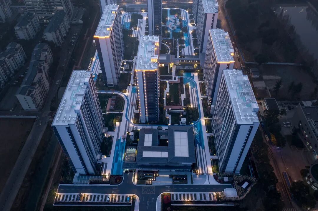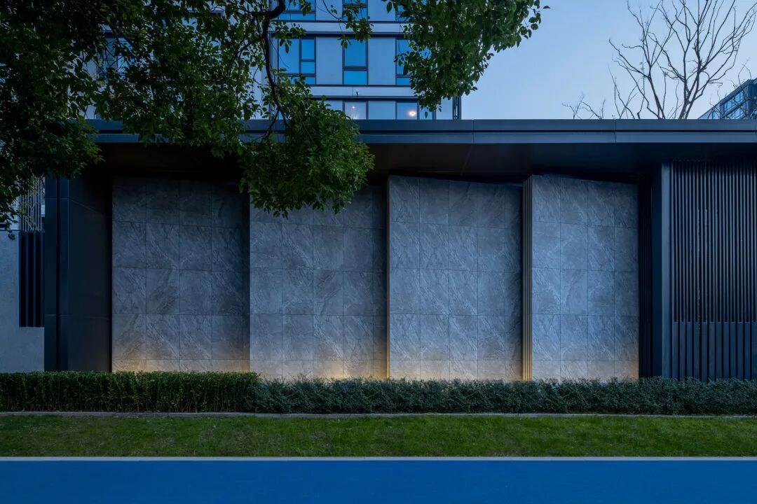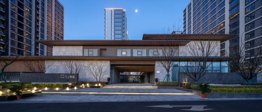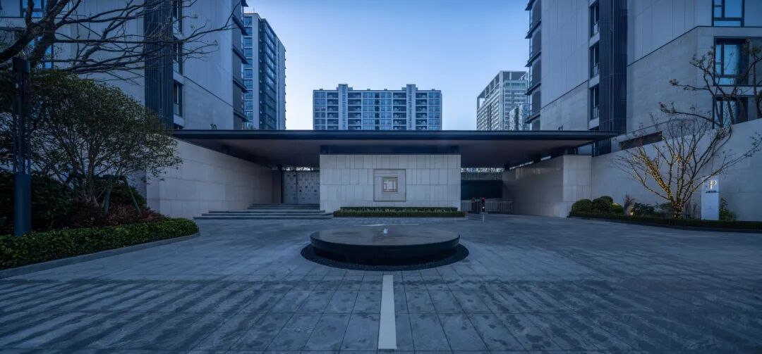 舒雅而惬意的生活,从这里开始。入口门头采用48*4.5米的大跨度钢结构,以现代简约的设计,一叙江南雅意。金属与石材相得益彰,与水景前广场形成酒店式落客,在极具纵深感和仪式感的入口中,婉转出江南的细腻与柔情。