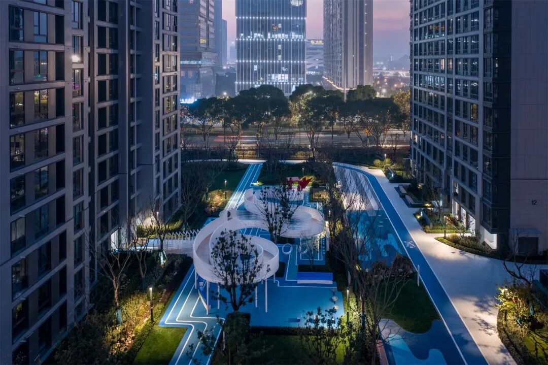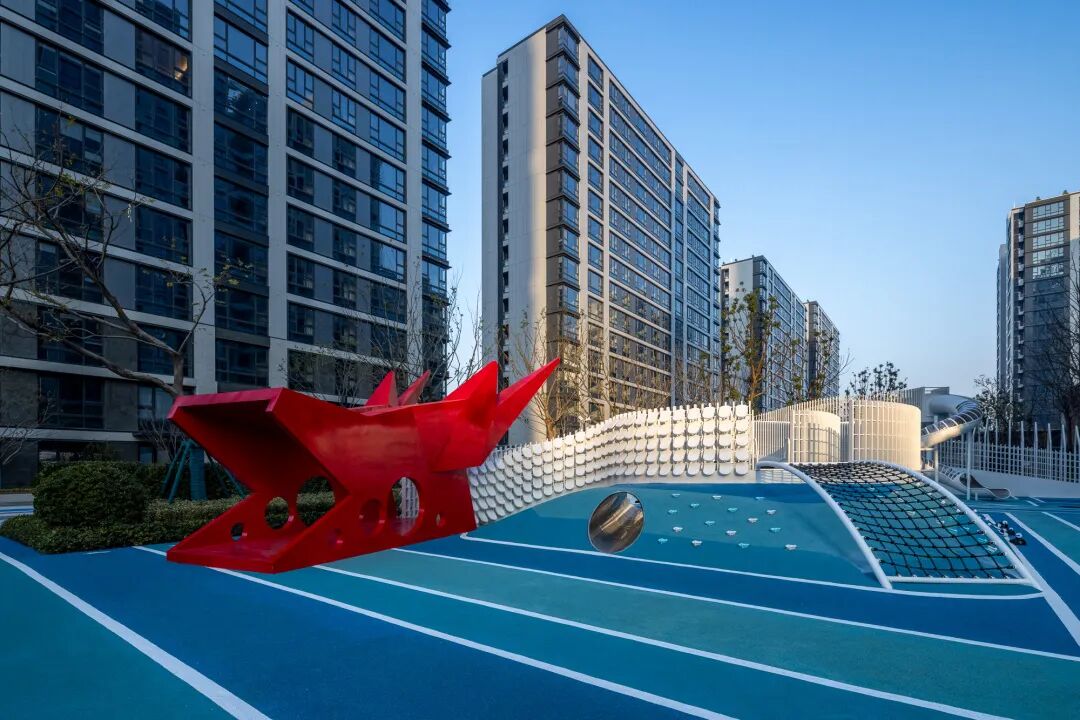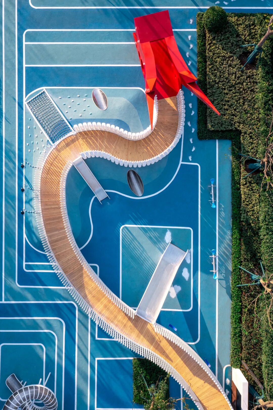 古韵承新,青龙的姿态、色彩以一种更为现代的方式展现出来,蜿蜒的龙身,雪白的龙鳞,结合略抽象的艺术龙头,为孩子们带来无限的想象空间。深浅交织的地面铺装,拟江之浪涌,青龙跃身其中,带来灵动、鲜活之感。龙身植入滑梯、攀爬网等多种儿童设施,让孩子们自在的追逐、嬉闹,尽情展露笑颜。