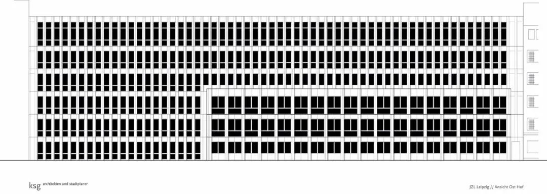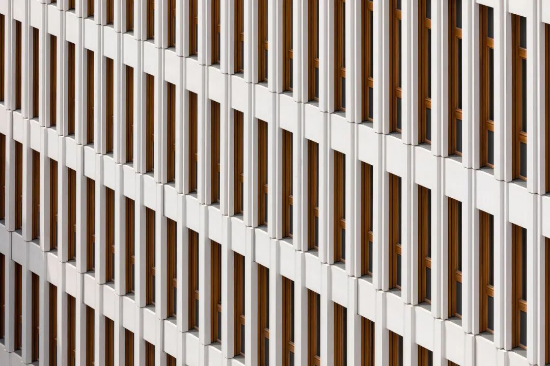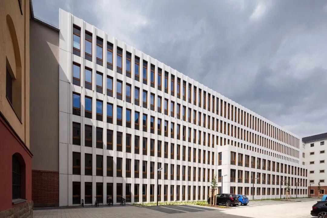 内院区的新建筑将现有的两座建筑连接起来,作为一个简单、结构清晰、设计沉稳的行政建筑。由浅色混凝土构件制成的六层后通风立面水平分为三个部分,每个部分垂直连接两个楼层。