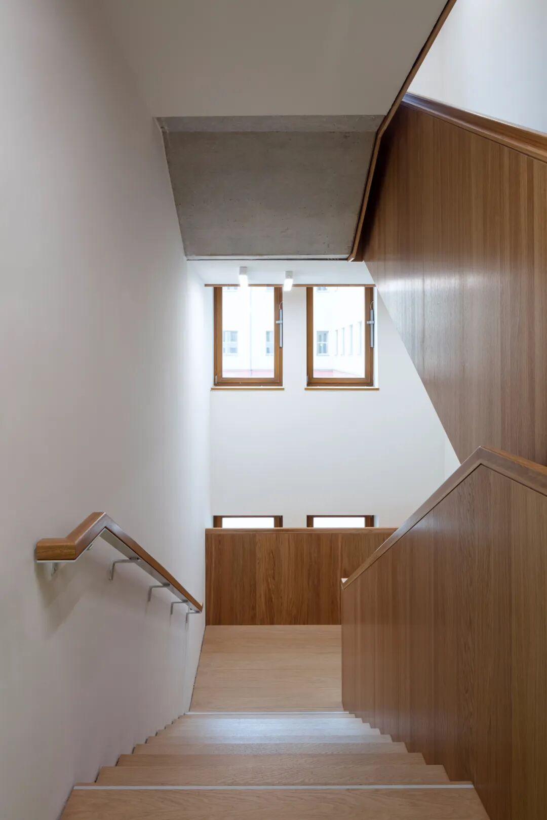 这个选定的分区将建筑高度拉回,从而调节相邻的四层住宅楼。新结构从一楼到二楼较宽,然后在较高楼层后退。这使这座长约 70 米、外观朴素的建筑具有结构化和光滑的外观。此外,结构的长度被垂直窗户格式打断,在每层楼的上部和下部区域,在栏杆和门楣前面显示为盲窗。