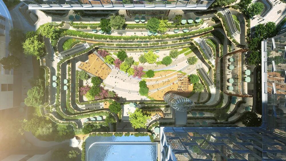 为激活周边社区,设计以24小时公共立体步道,衔接城市绿廊系统,通过绿色景观平台即可便捷通往周边公园。同时通过商业内部庭院、下沉广场及地下公共通廊与地铁交通多维连接,构建城市绿色网络。