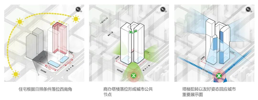 项目由一座商业裙楼以及三座互相连接的塔楼组成。设计通过塔楼后移释放出入口广场空间,以开放的姿态迎接各方访客。并精心考量布局朝向,确保将周边的公园及水库景观资源最大化,让每座塔楼都得享美景的同时,将住宅塔楼设置于地块西南角,使其日照最大化。