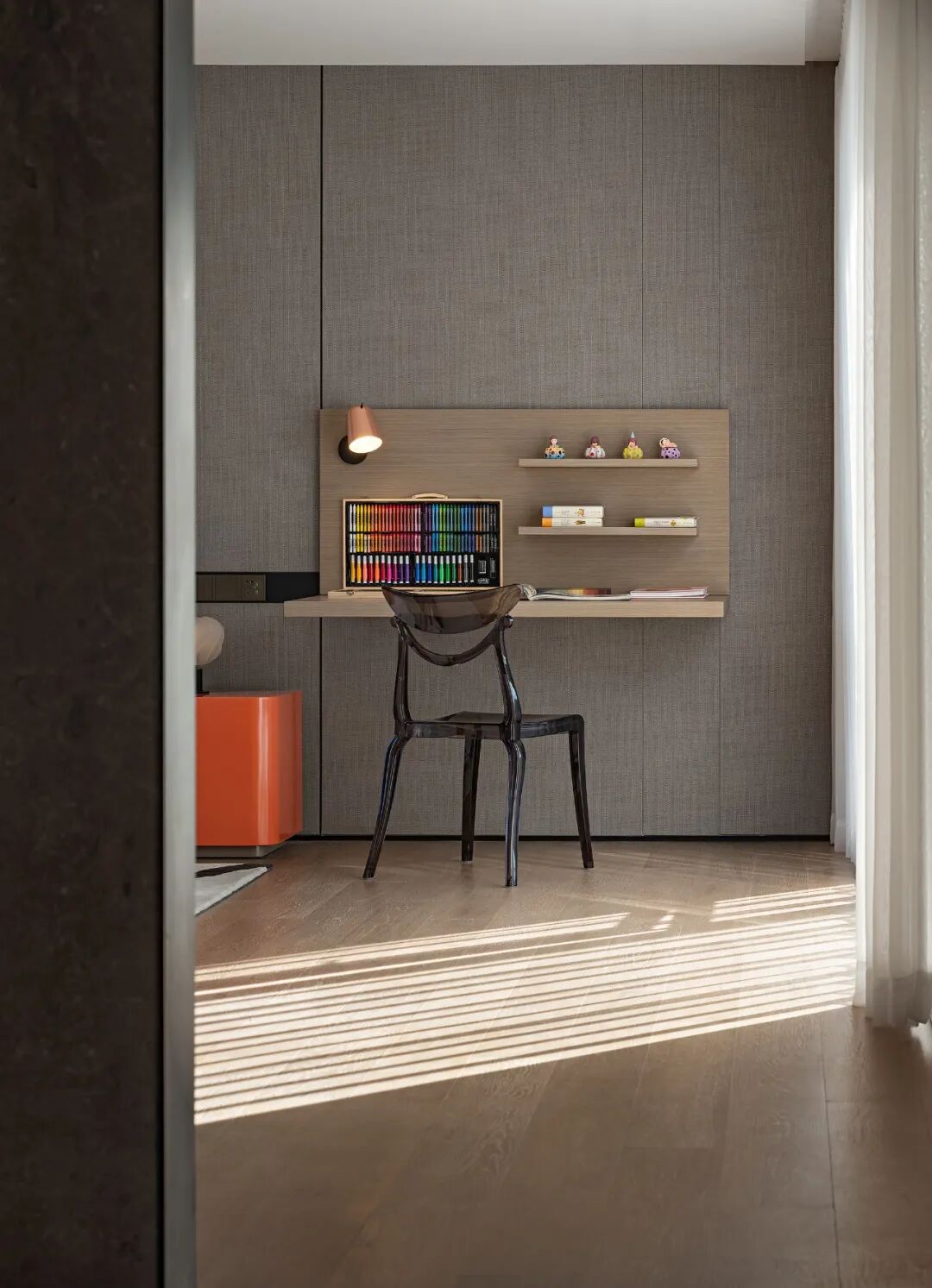 设计师赋予孩童的空间以生活方式的动态变化感,以艺术化的解构手法让空间极具包容性。沉稳的墨青调与窗外苍翠相映,诠释独属于男孩房的充沛活力,丰富的物件伴随着居者的成长步伐,存续无限记忆。
